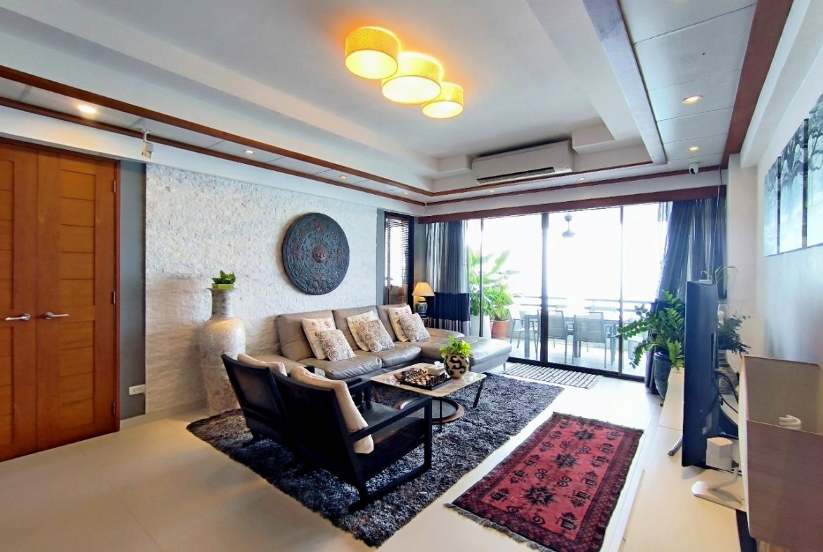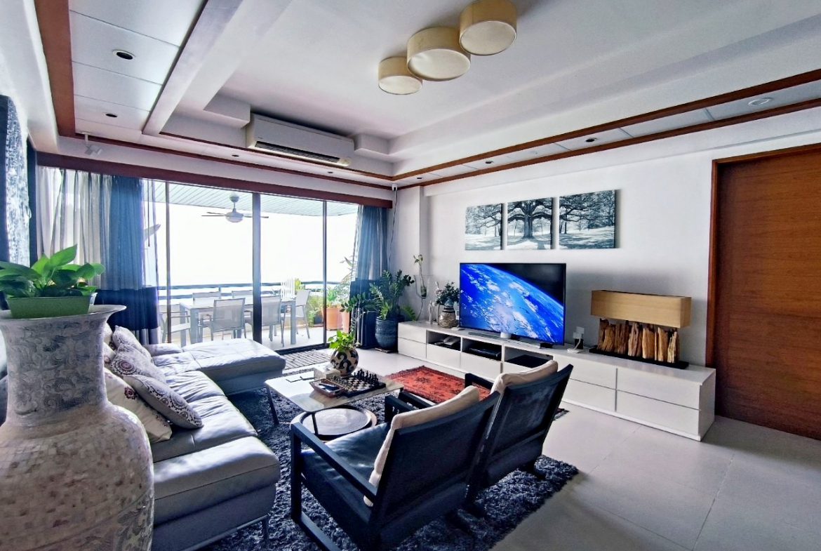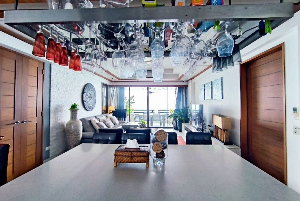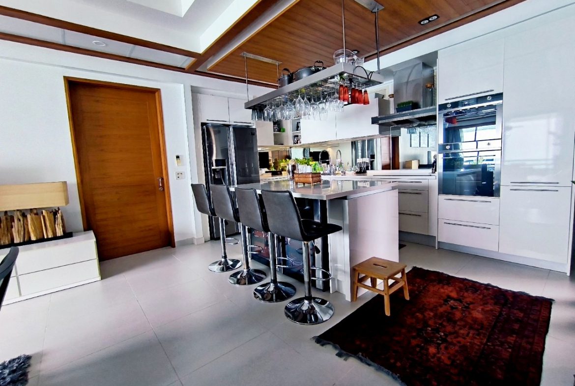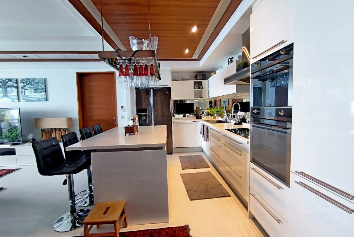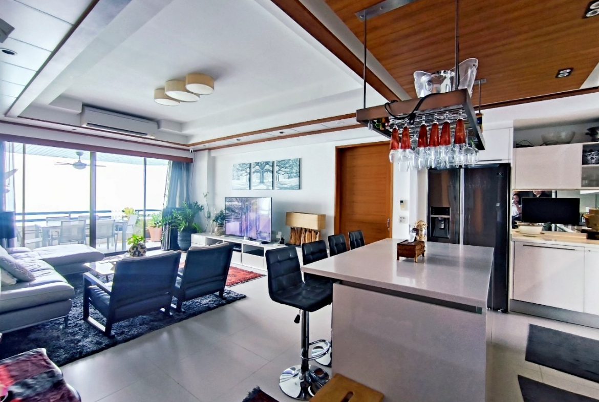 Sunset Heights Condo in Na Jomtien offers luxurious beachfront living with breathtaking ocean views. This spacious 118 Sqm, 2-bedroom, 2-bathroom condo features an open-plan living area that seamlessly connects to the kitchen and a balcony, perfect for entertaining or enjoying the stunning sea views. The modern European kitchen has high-end appliances, including a dishwasher and a pizza oven.