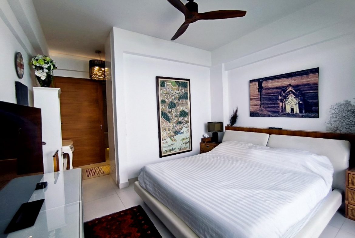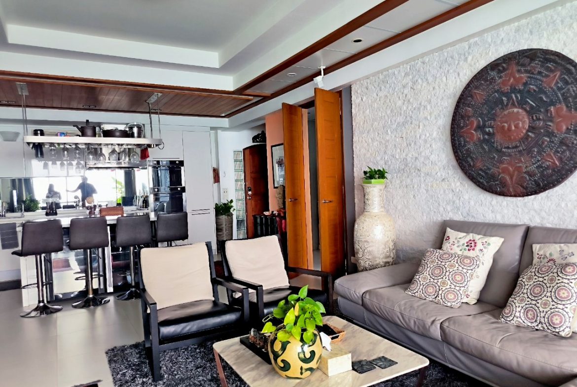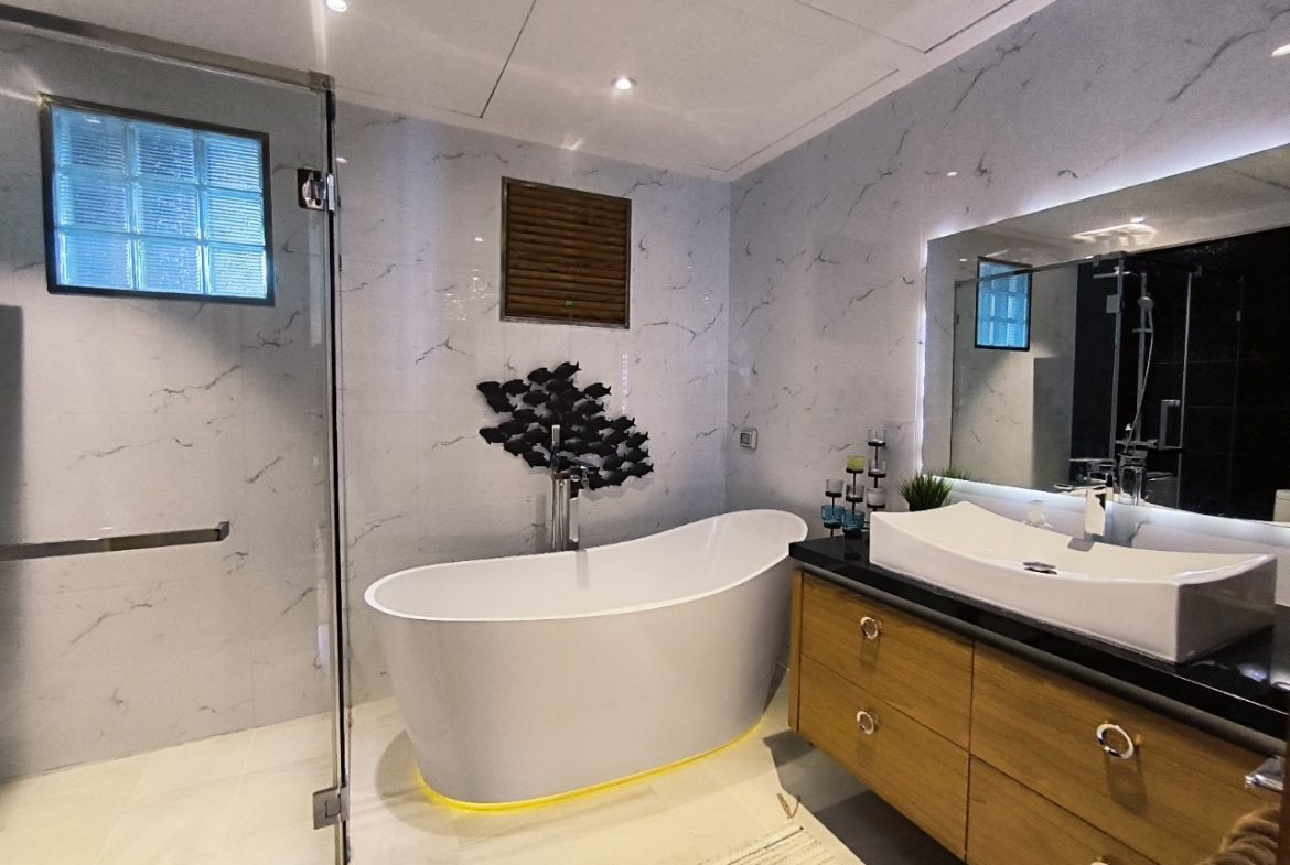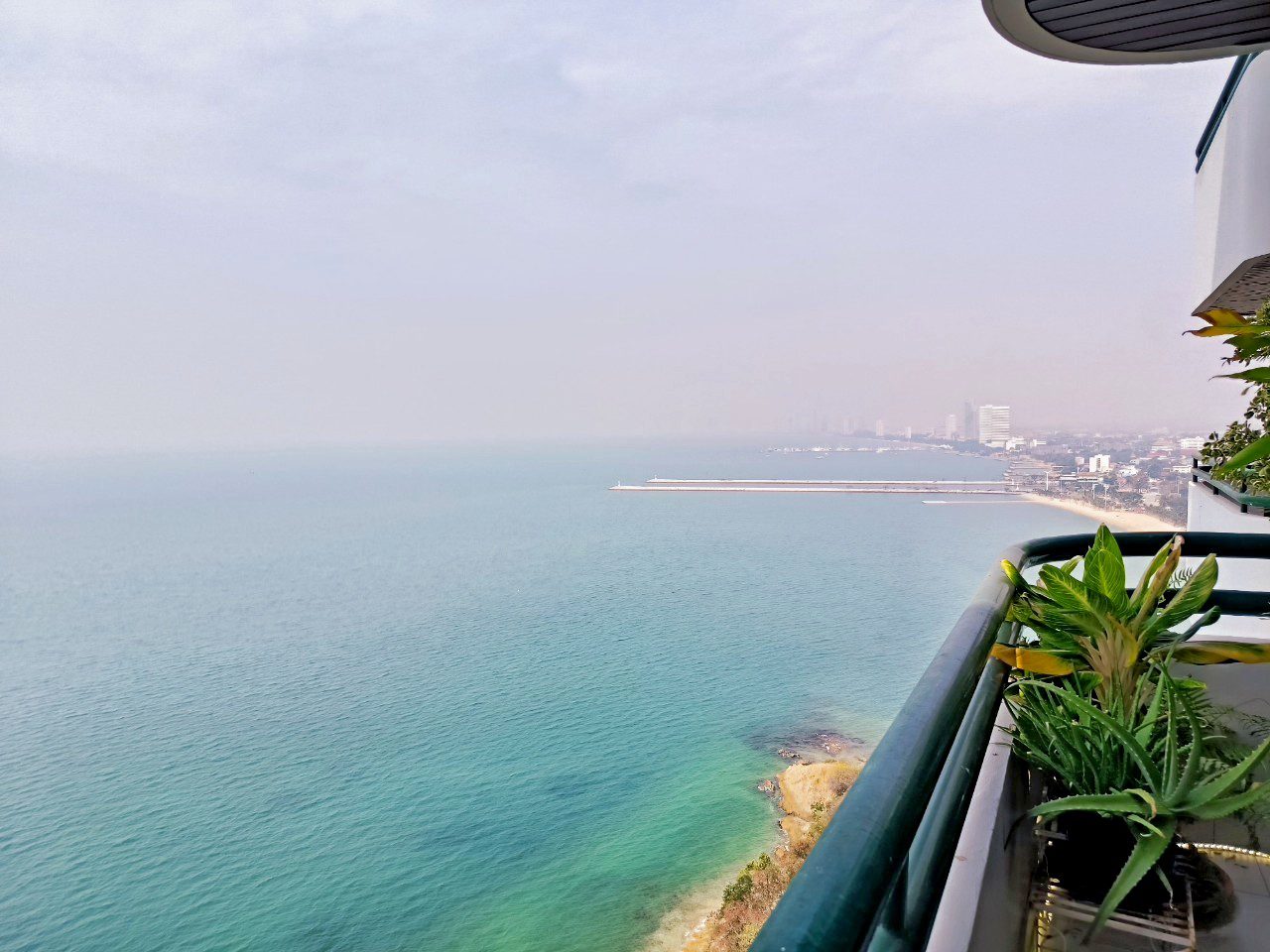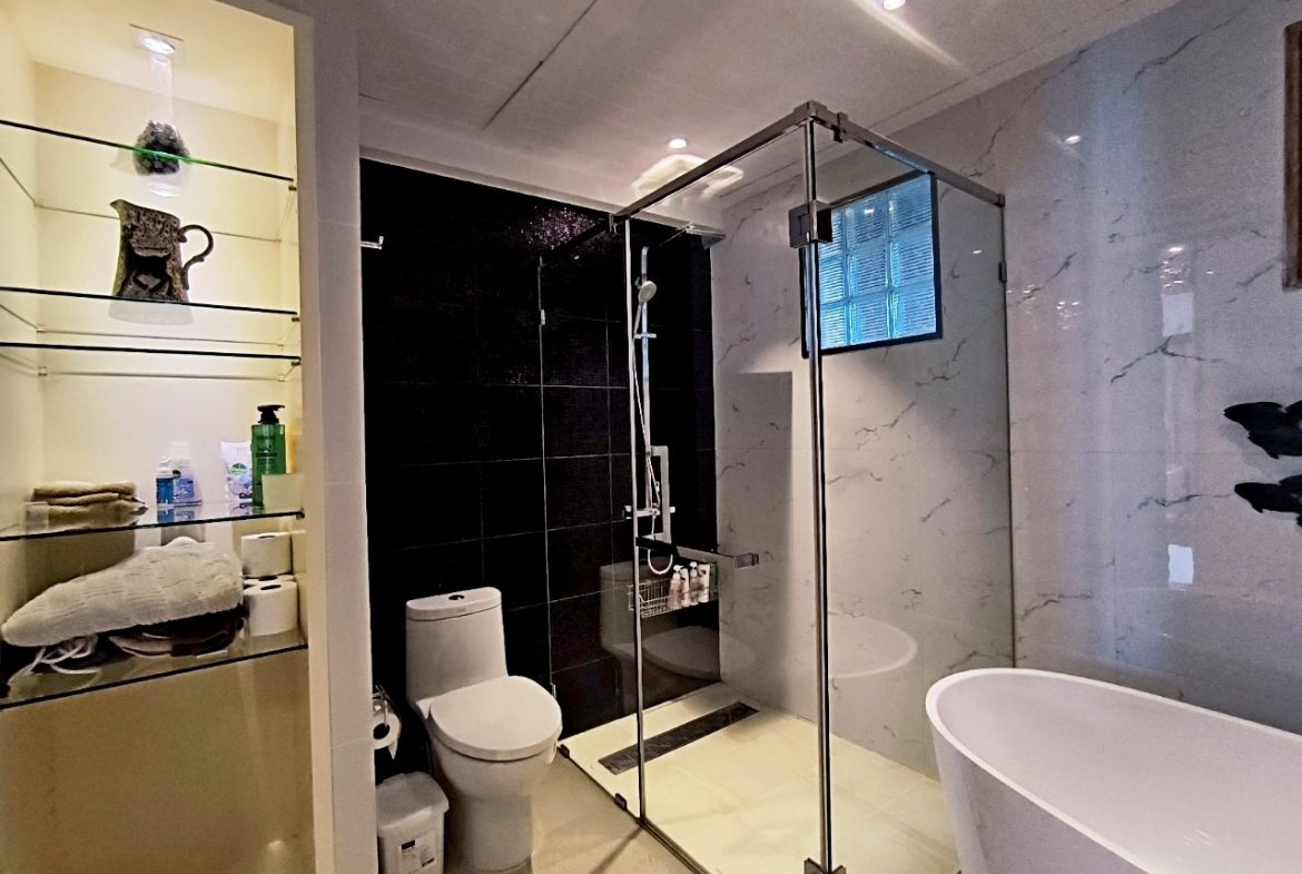 Sunset Heights Condo in Na Jomtien offers luxurious beachfront living with breathtaking ocean views. This spacious 118 Sqm, 2-bedroom, 2-bathroom condo features an open-plan living area that seamlessly connects to the kitchen and a balcony, perfect for entertaining or enjoying the stunning sea views. The modern European kitchen has high-end appliances, including a dishwasher and a pizza oven.