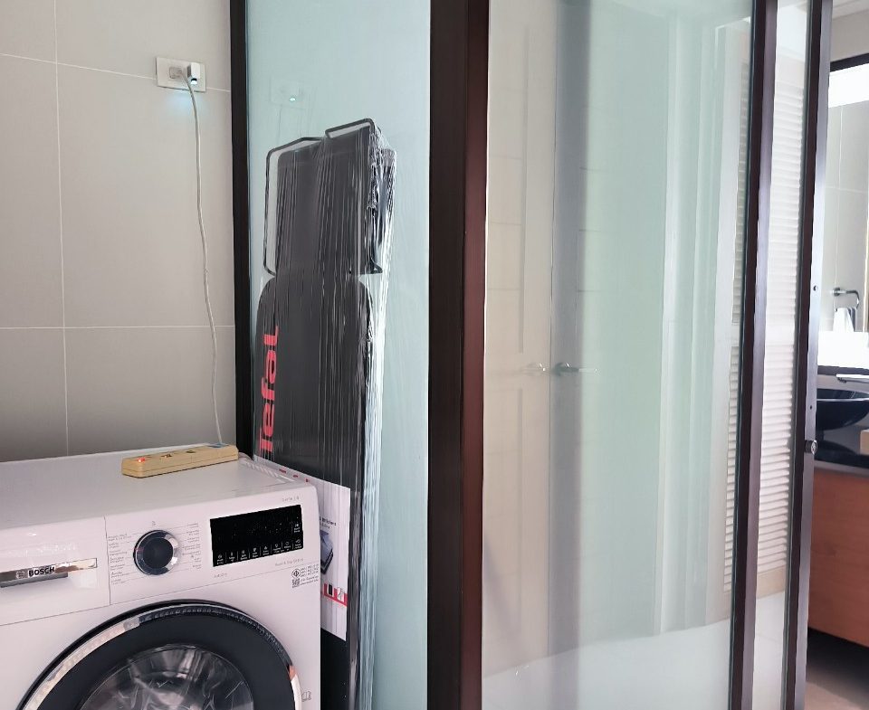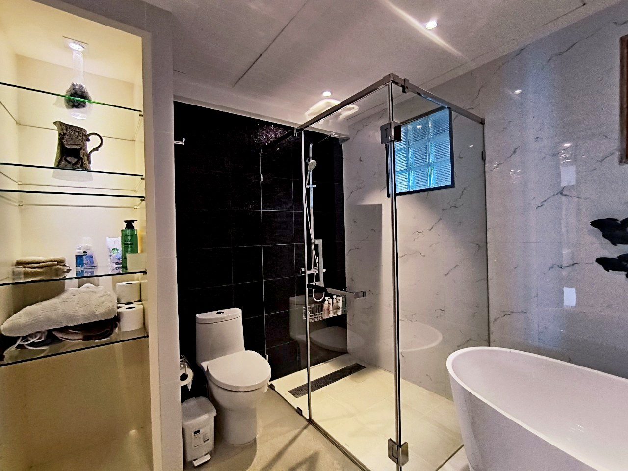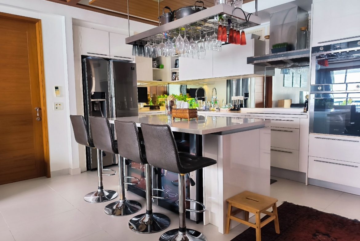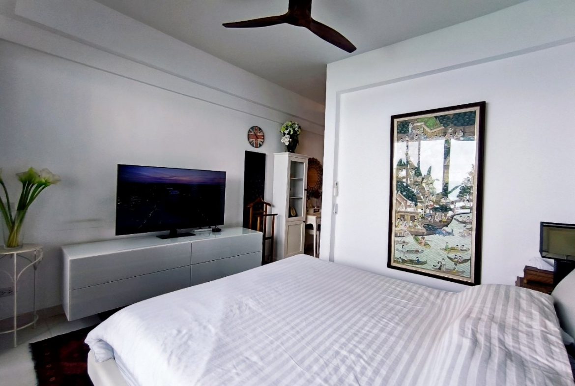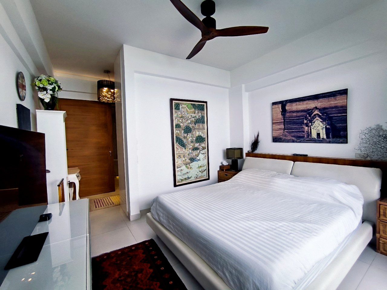 Sunset Heights Condo in Na Jomtien offers luxurious beachfront living with breathtaking ocean views. This spacious 118 Sqm, 2-bedroom, 2-bathroom condo features an open-plan living area that seamlessly connects to the kitchen and a balcony, perfect for entertaining or enjoying the stunning sea views. The modern European kitchen has high-end appliances, including a dishwasher and a pizza oven.