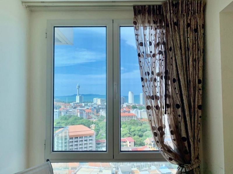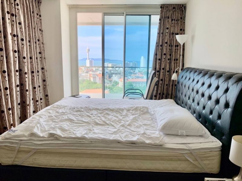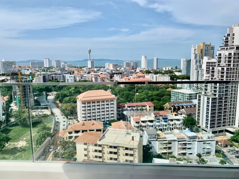 19th floor, 1 bedroom corner unit with 2 balconies,69.7 sqm. (Type D), tremendous sea views. Corner unit with views into Pattaya Bay and Jomtien Beach! Fully furnished and equipped, washing machine, kitchenware, kettle, rice cooker, microwave, bed sheets, towels, ready to move in.