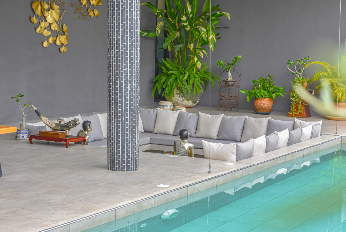 Step outside to a lush tropical escape — shaded patio, overhanging rooflines, and a resort-style private pool nestled in nature.