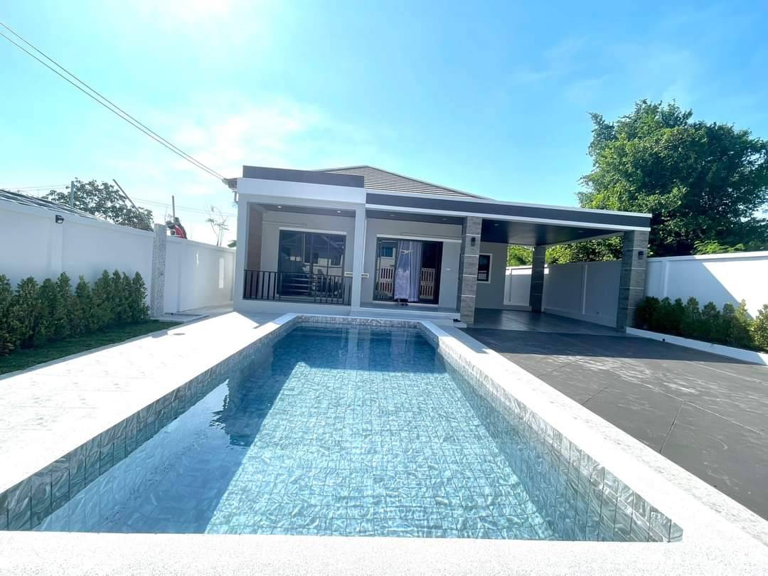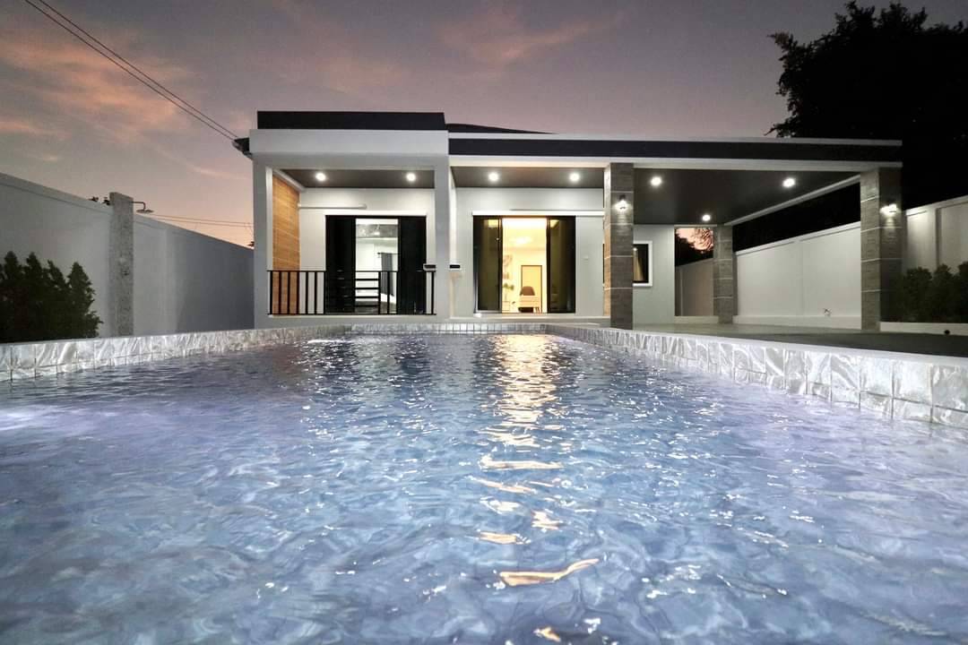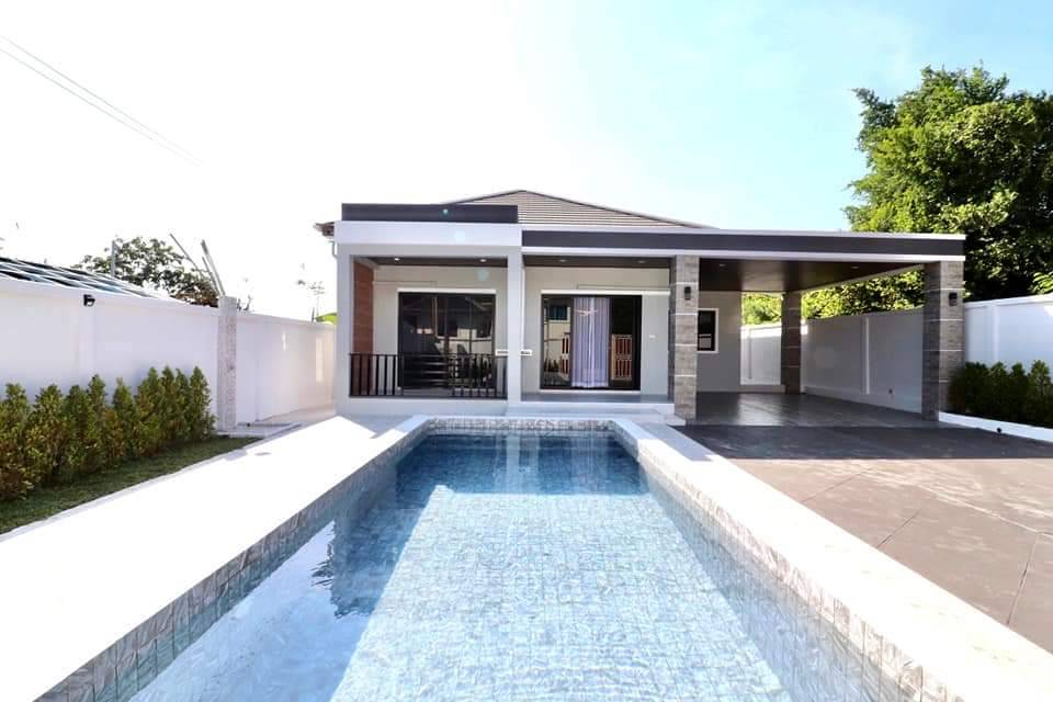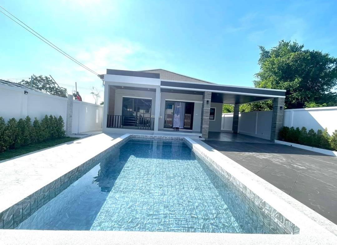 Pool villa (New house) for Sale at Huayyai Pattaya, It is 3 bedrooms, 2 bathrooms, a Land area of 400 Sqm., fully furnished built-in with a swimming pool, 5 air conditioners, TV 55″, 2 heaters, Large kitchen and dining rooms for free!!, It is government electricity and water, free pump and water tank 1,000 Lite, Parking inside 4-5 cars, Ready to move in