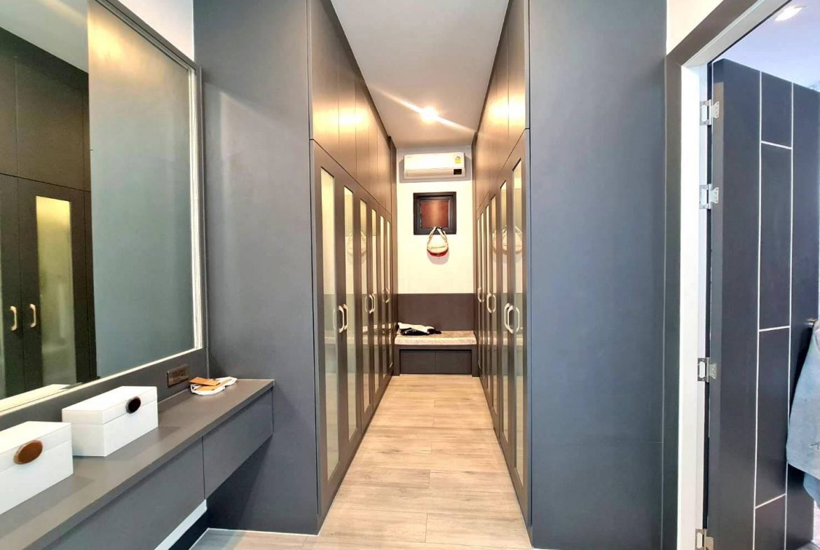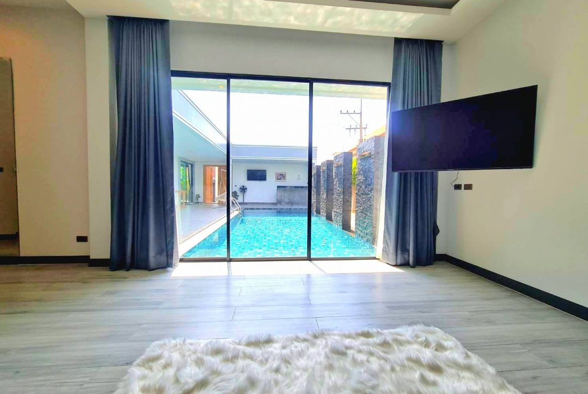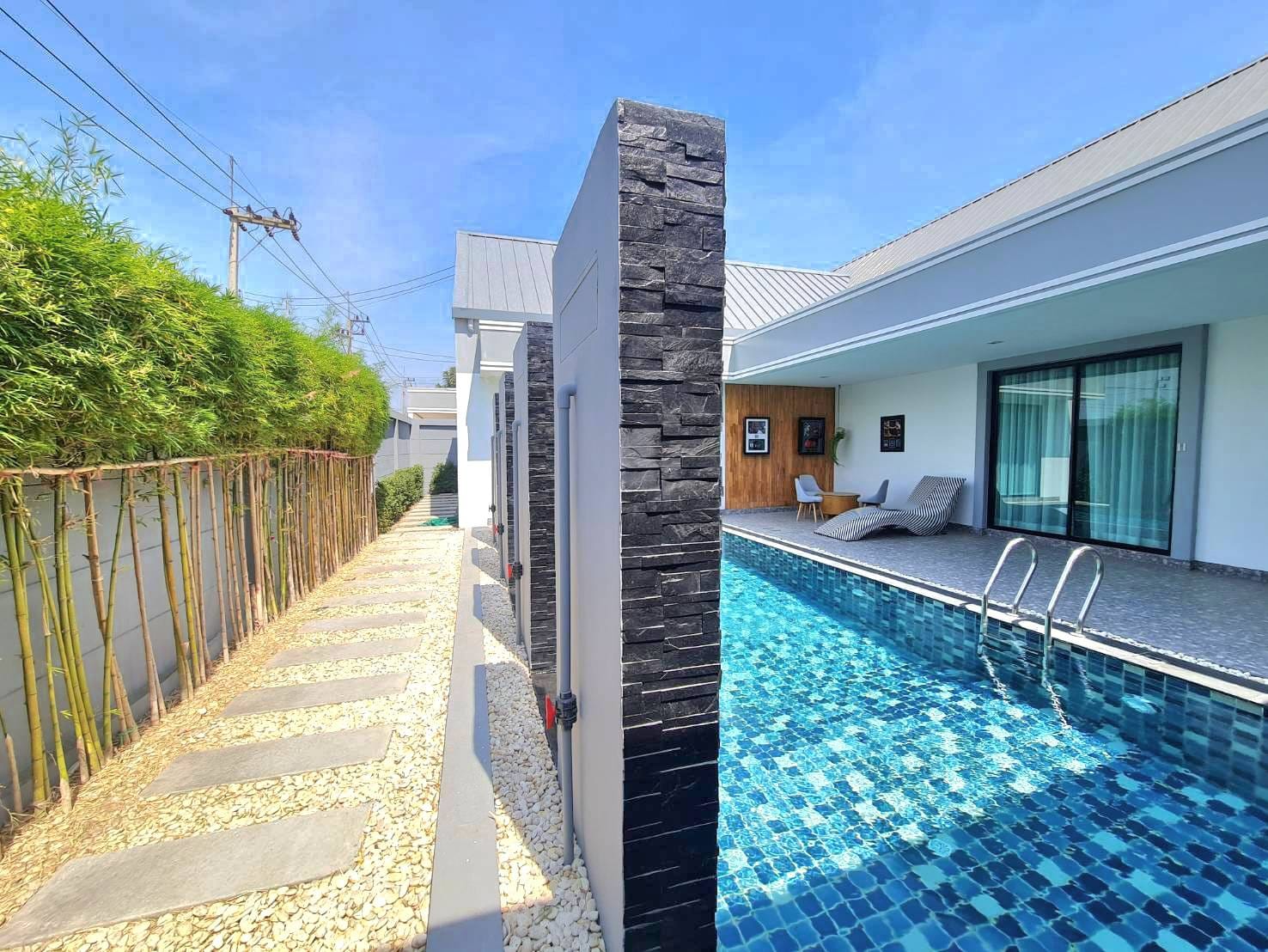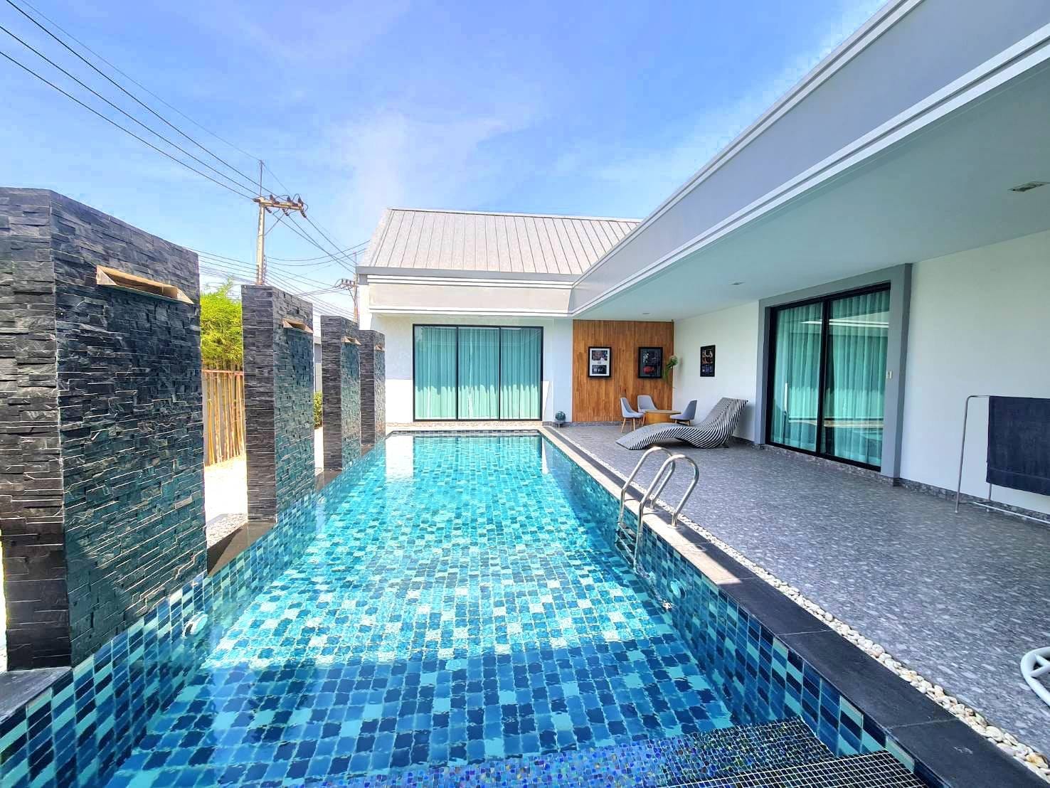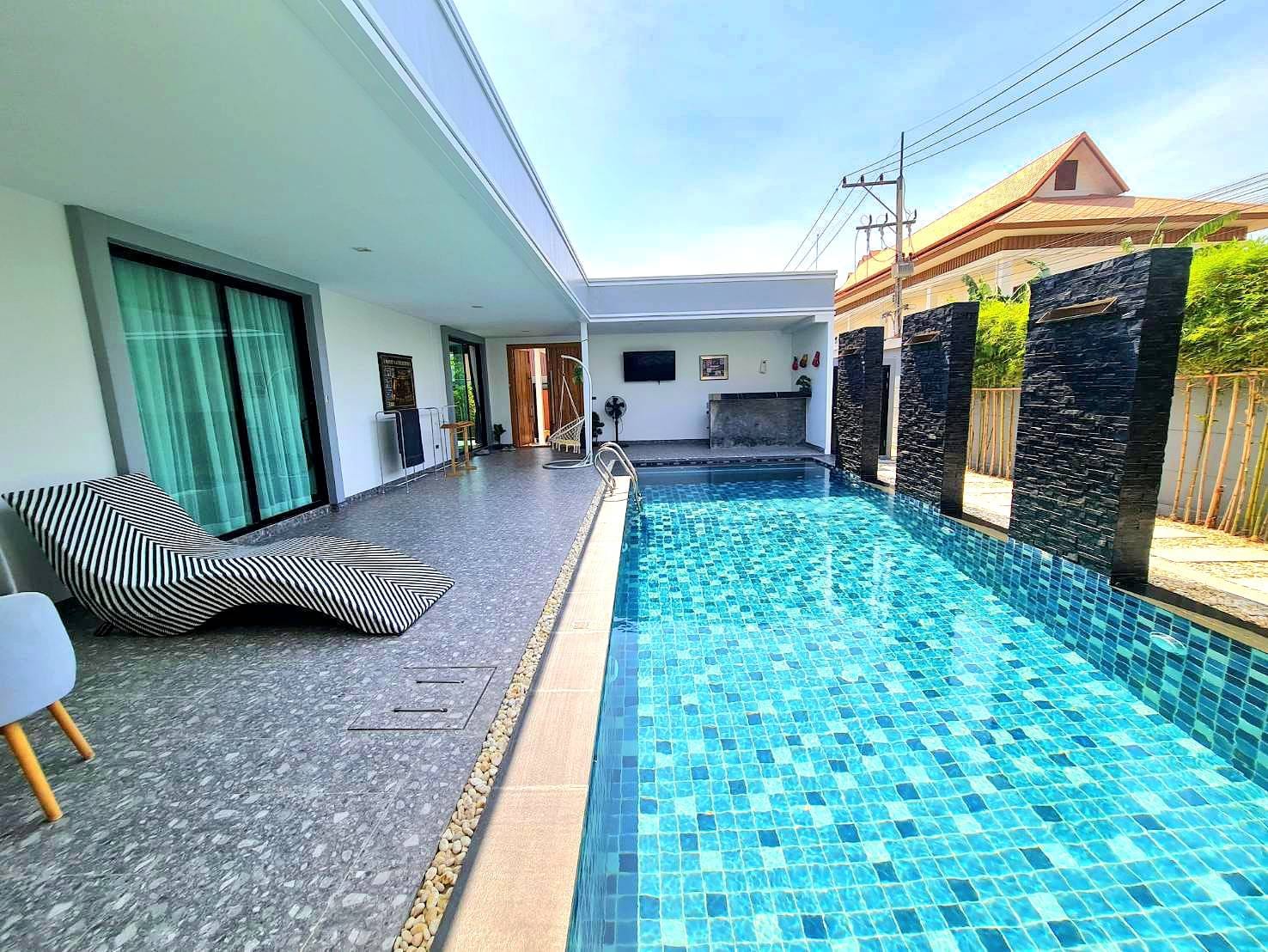 Baan Mae 1 Pool Villa, is a large land size of 544 Sq.m., Usage space 203 Sq.m., with 3 bedrooms, 3 bathrooms (all ensuite), and a walk-in closet in all bedrooms, Saltwater system swimming pool, pool size 8.3×4.2 meters with waterfall, Outside Counter Bar with Big screen TV remote control curtains, Included all furniture and Electrical Appliances.