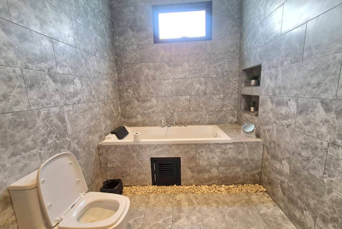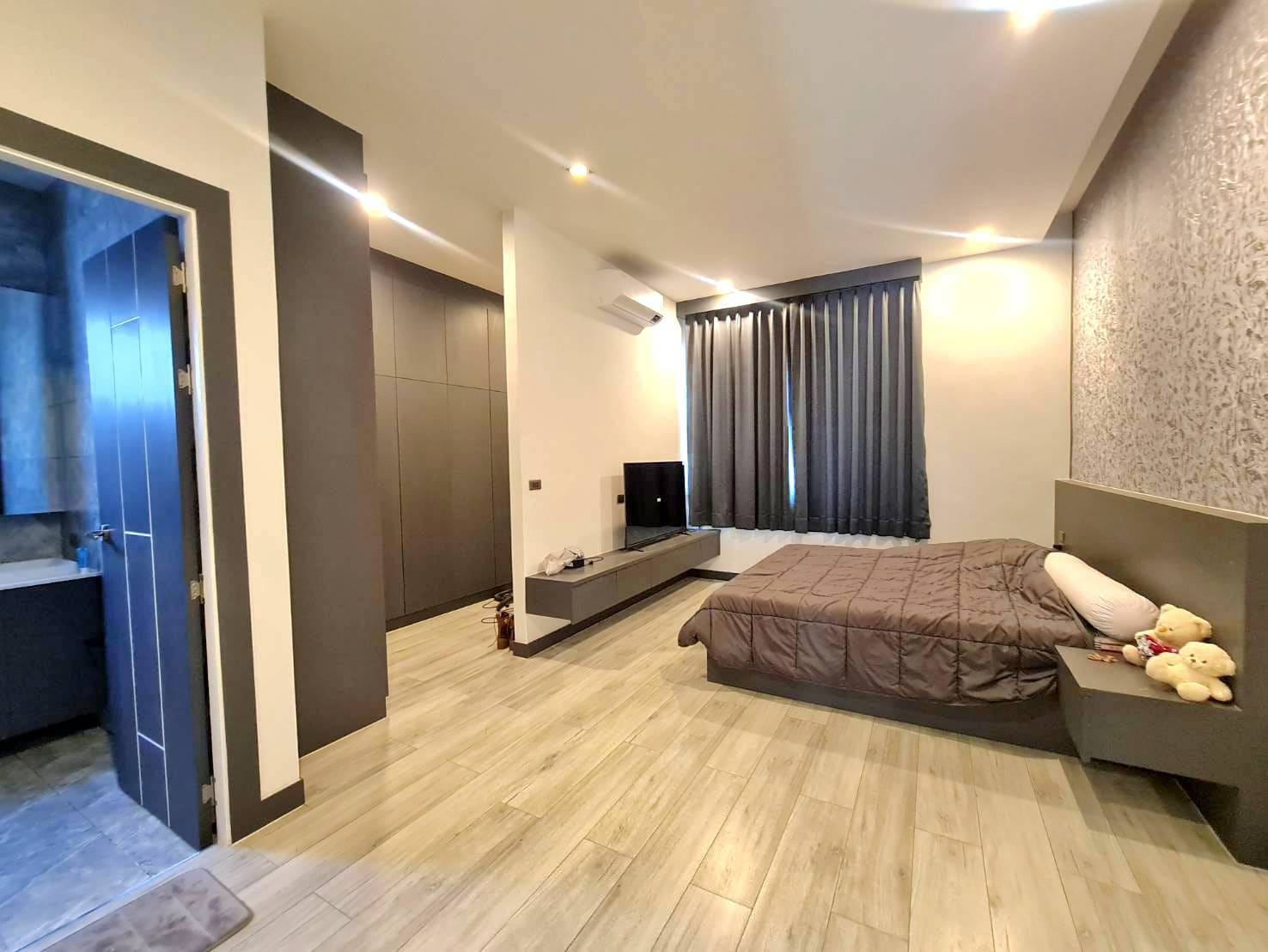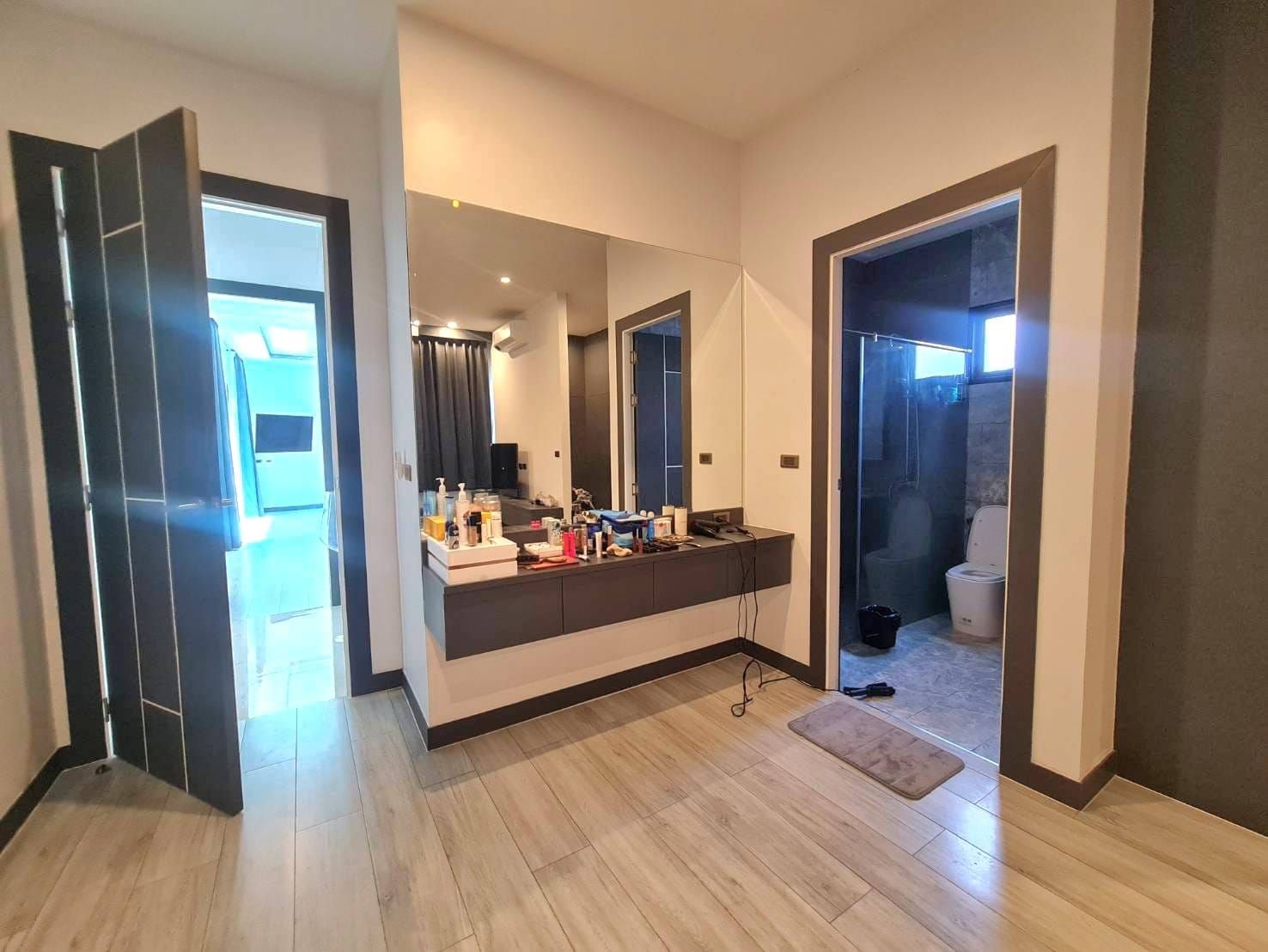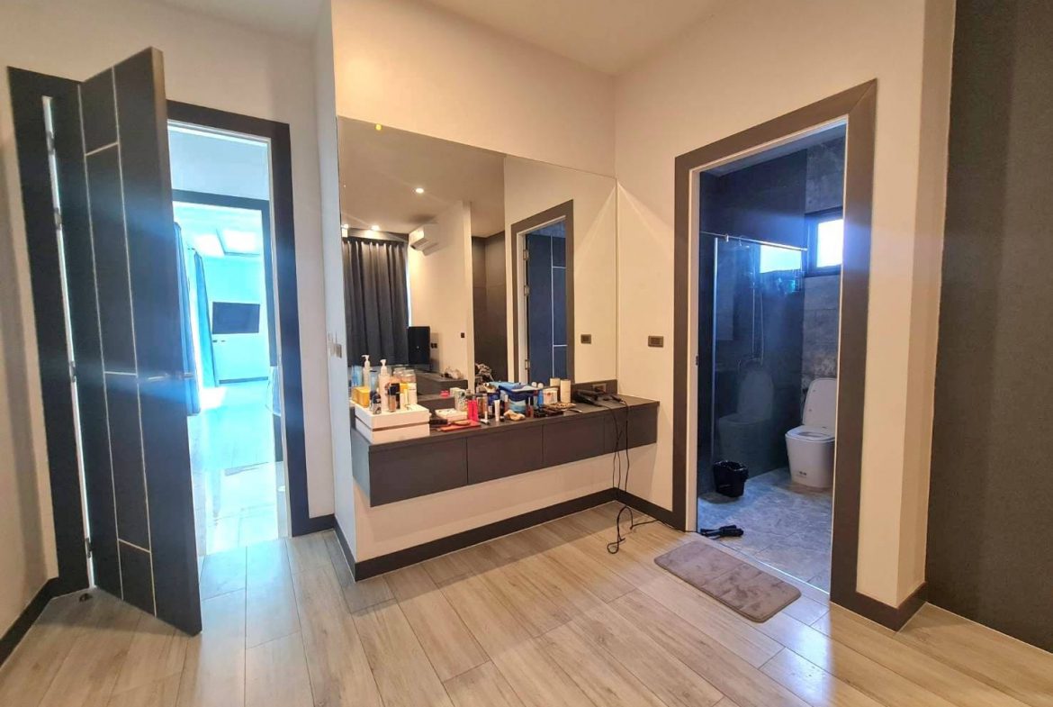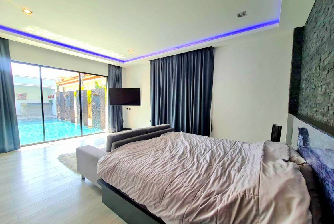 Baan Mae 1 Pool Villa, is a large land size of 544 Sq.m., Usage space 203 Sq.m., with 3 bedrooms, 3 bathrooms (all ensuite), and a walk-in closet in all bedrooms, Saltwater system swimming pool, pool size 8.3×4.2 meters with waterfall, Outside Counter Bar with Big screen TV remote control curtains, Included all furniture and Electrical Appliances.