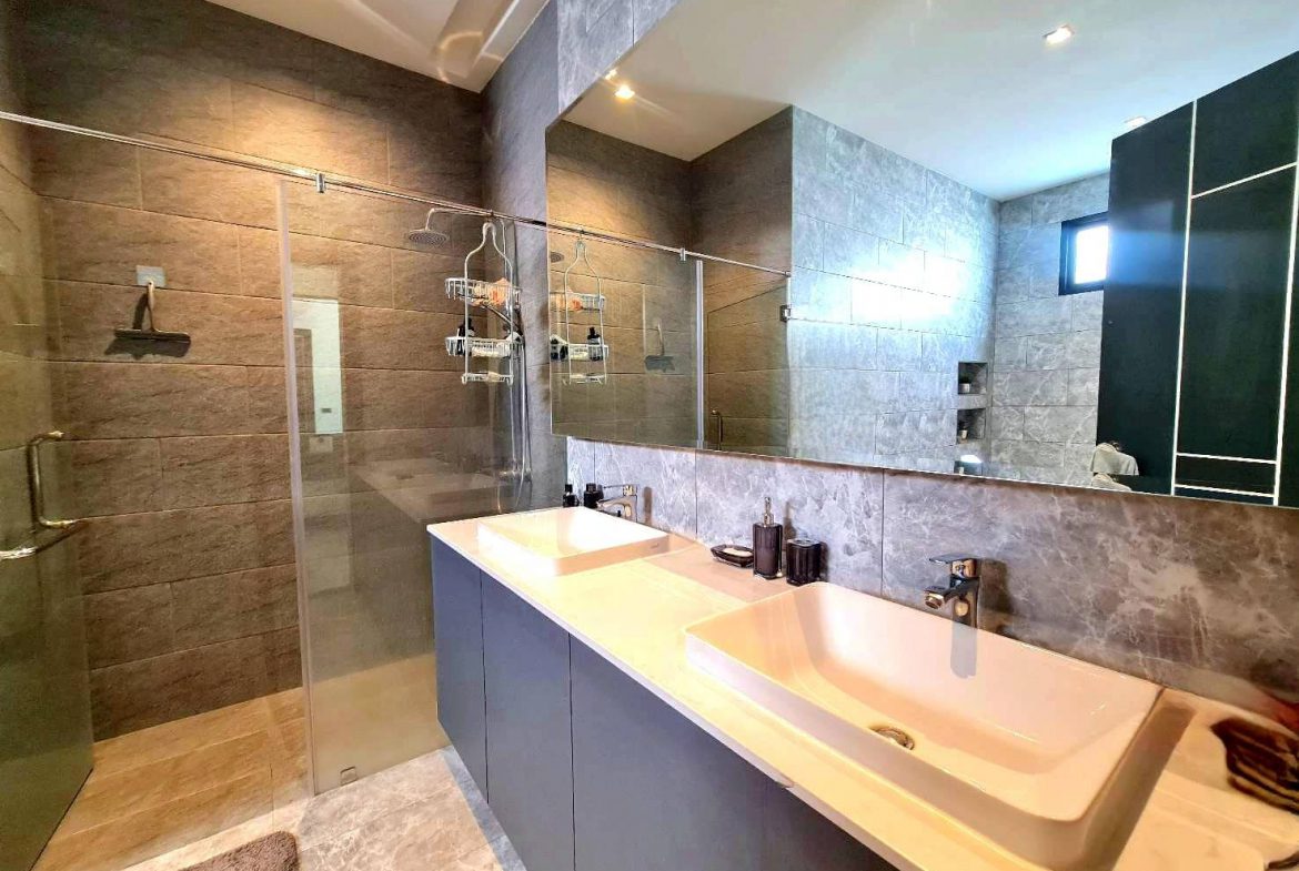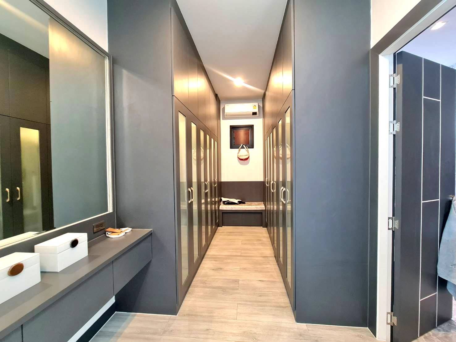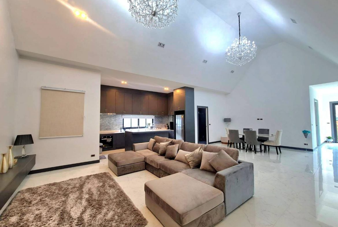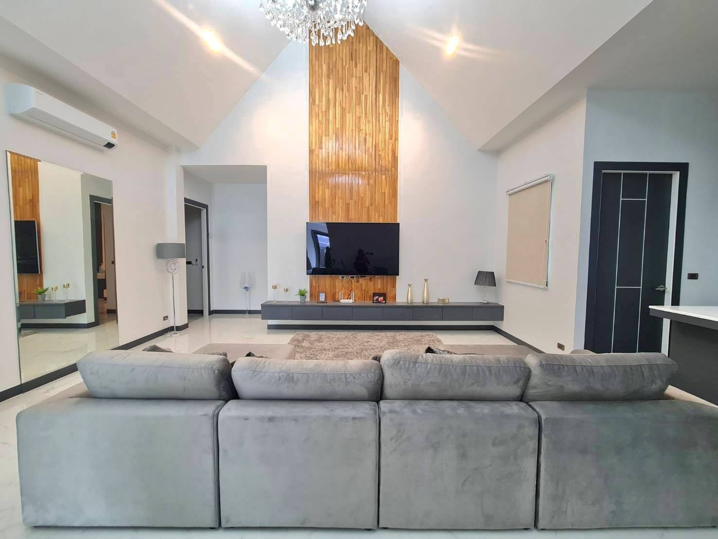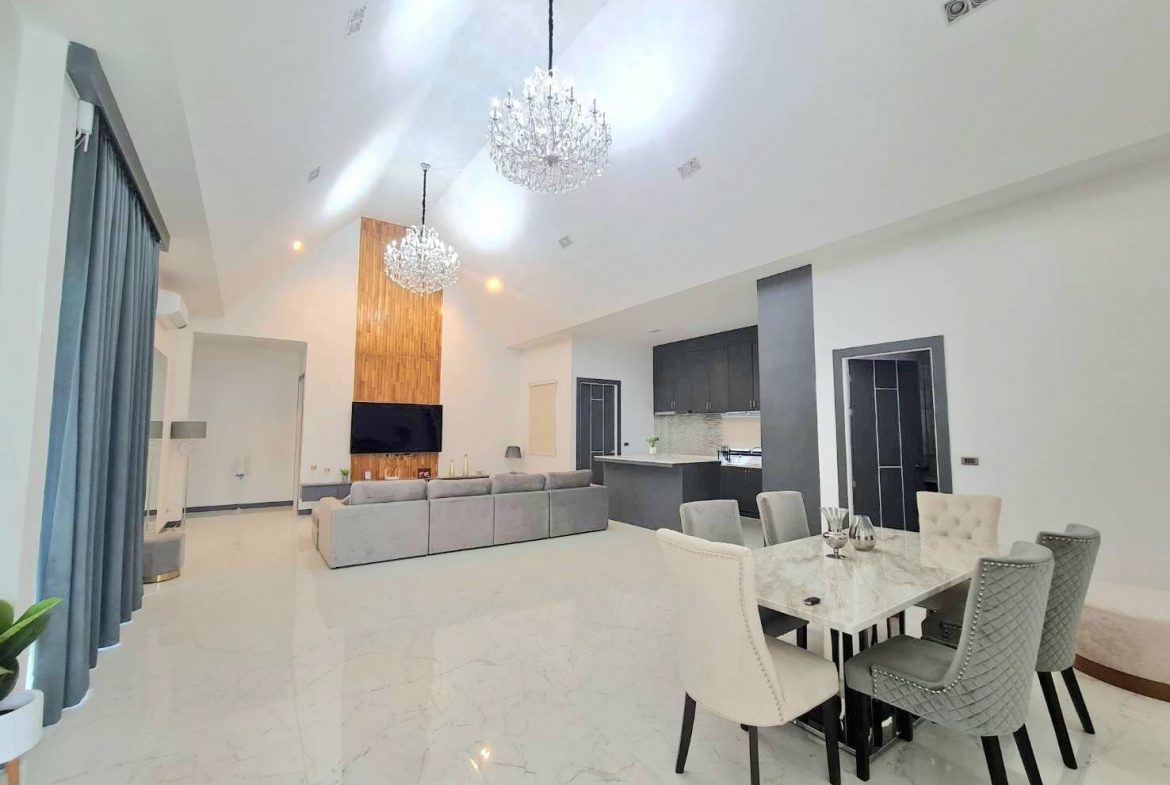 Baan Mae 1 Pool Villa, is a large land size of 544 Sq.m., Usage space 203 Sq.m., with 3 bedrooms, 3 bathrooms (all ensuite), and a walk-in closet in all bedrooms, Saltwater system swimming pool, pool size 8.3×4.2 meters with waterfall, Outside Counter Bar with Big screen TV remote control curtains, Included all furniture and Electrical Appliances.