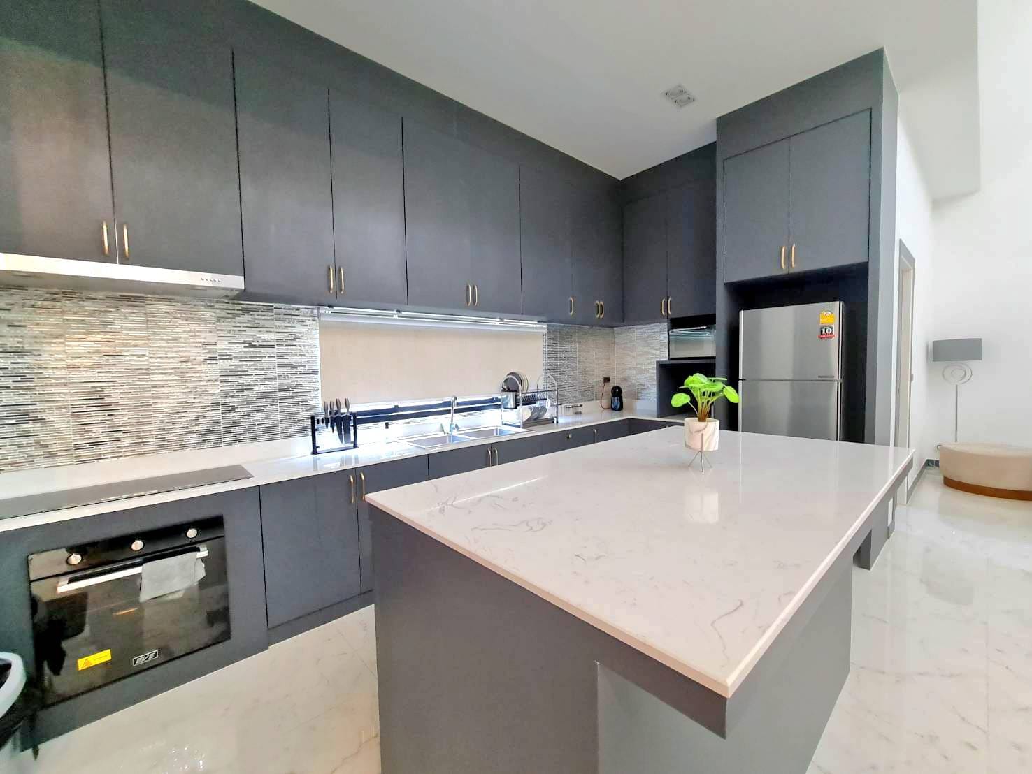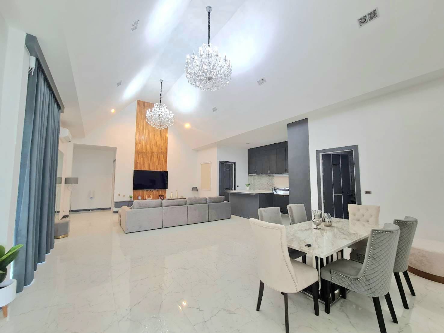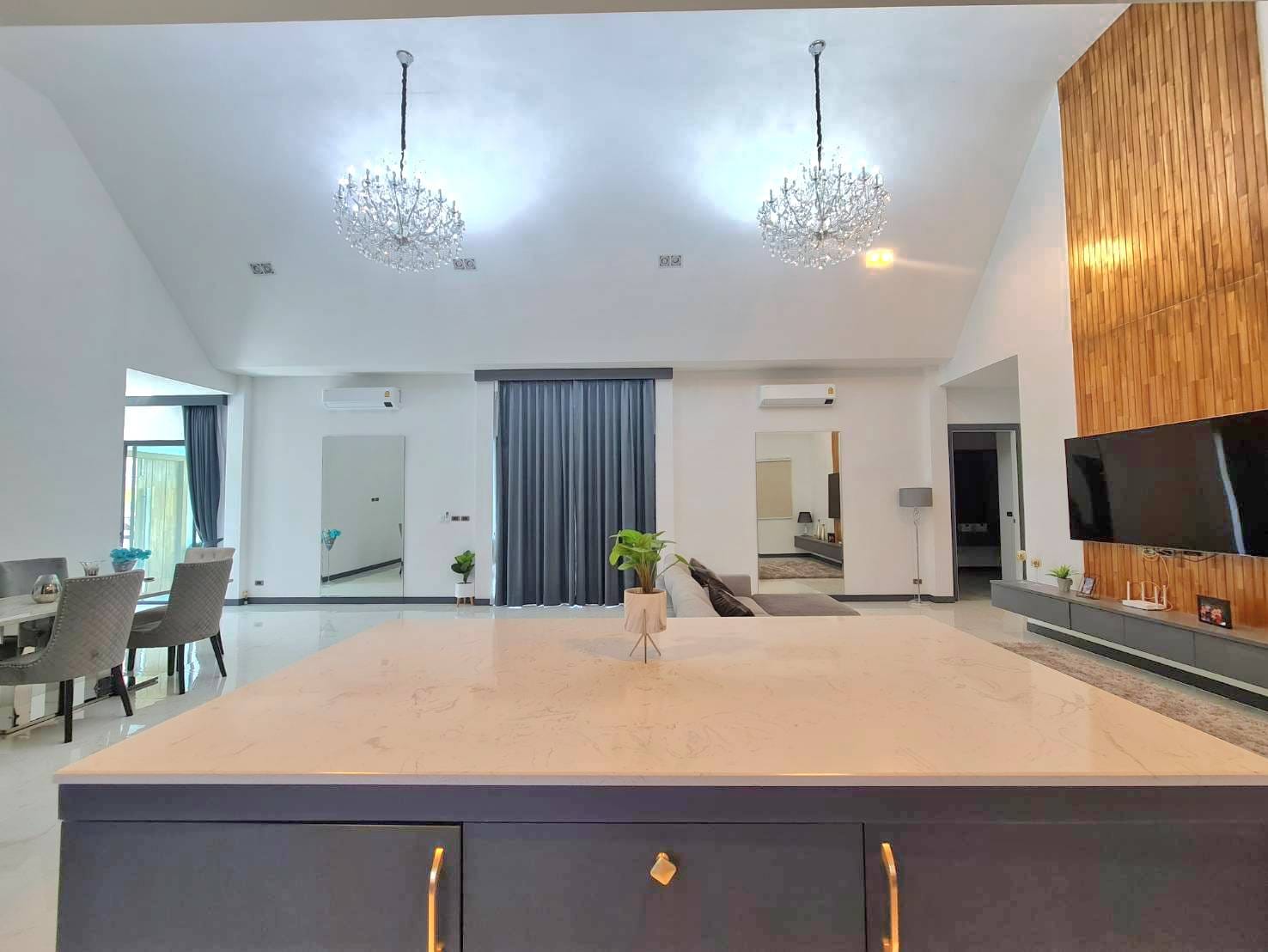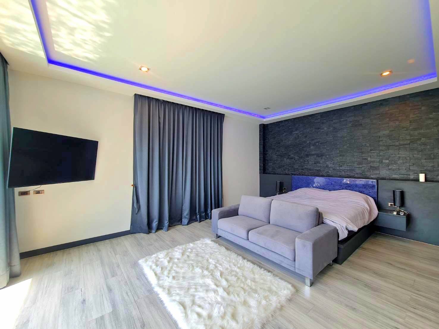 Baan Mae 1 Pool Villa, is a large land size of 544 Sq.m., Usage space 203 Sq.m., with 3 bedrooms, 3 bathrooms (all ensuite), and a walk-in closet in all bedrooms, Saltwater system swimming pool, pool size 8.3×4.2 meters with waterfall, Outside Counter Bar with Big screen TV remote control curtains, Included all furniture and Electrical Appliances.