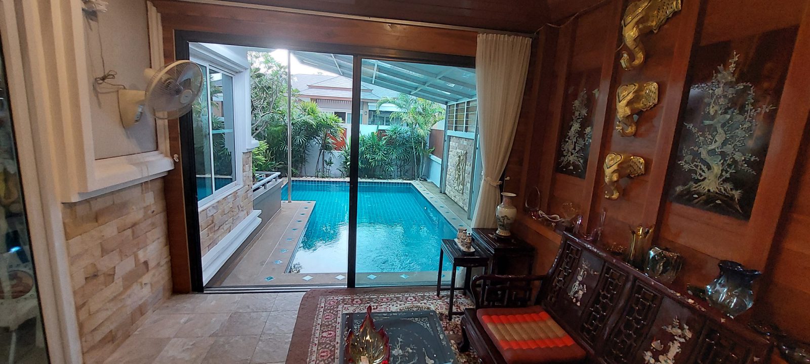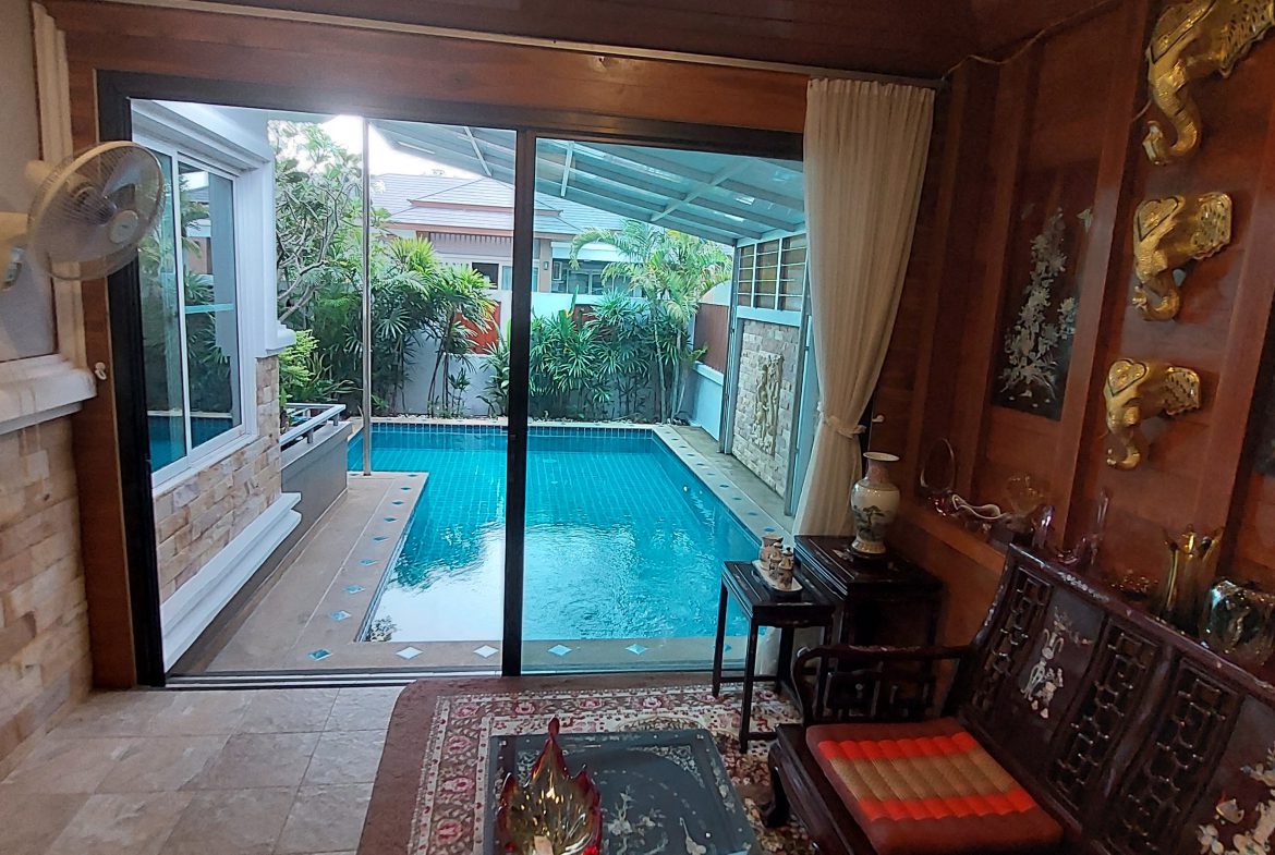 Pool Villa for Sale at Maneeya home East Pattaya 3 Bed, 2 Bath, Living Room, Office/Pool Room, European Style solid Oak Kitchen, Pool with Jacuzzi, Covered Car Parking for up to 4 cars. Inbuilt cupboards in the main bedroom, other furniture negotiable. 8 years old and built to western standards with high-quality fittings and maintained to high western standards. Pool 3.5/4.5m wide and 7m long with turquoise tiling and sandstone steps. Area: Land 79Tw (316m2), Internal 110m2, External Covered 105m2, Living Area 215m2