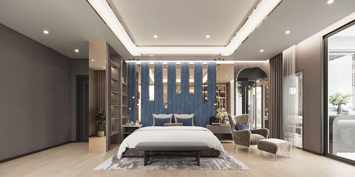 ♦️Master bedroom, spacious room with a king-size bed. Fully functional, outstanding with a Walk-in Closet with a private bathtub next to the 2nd-floor balcony bar, Pattaya city view.