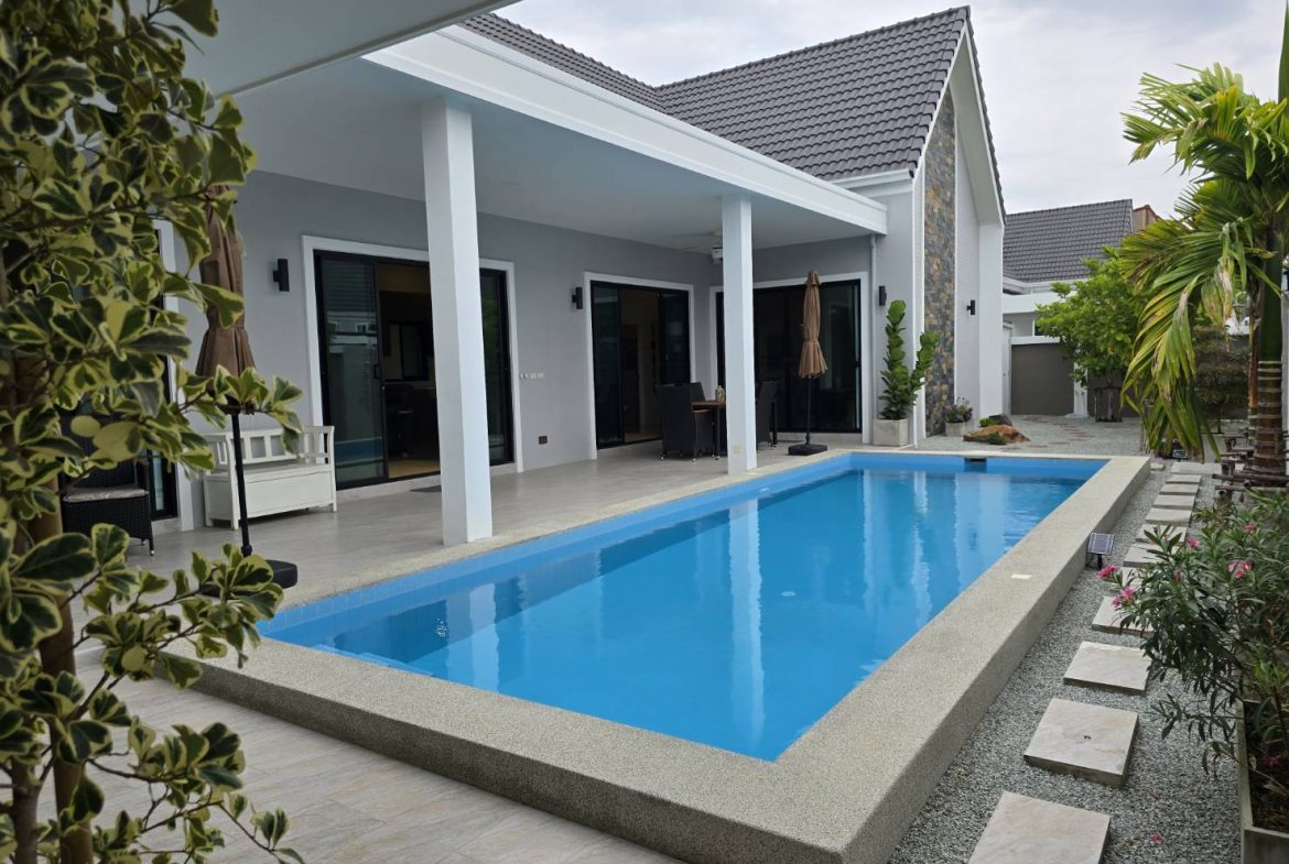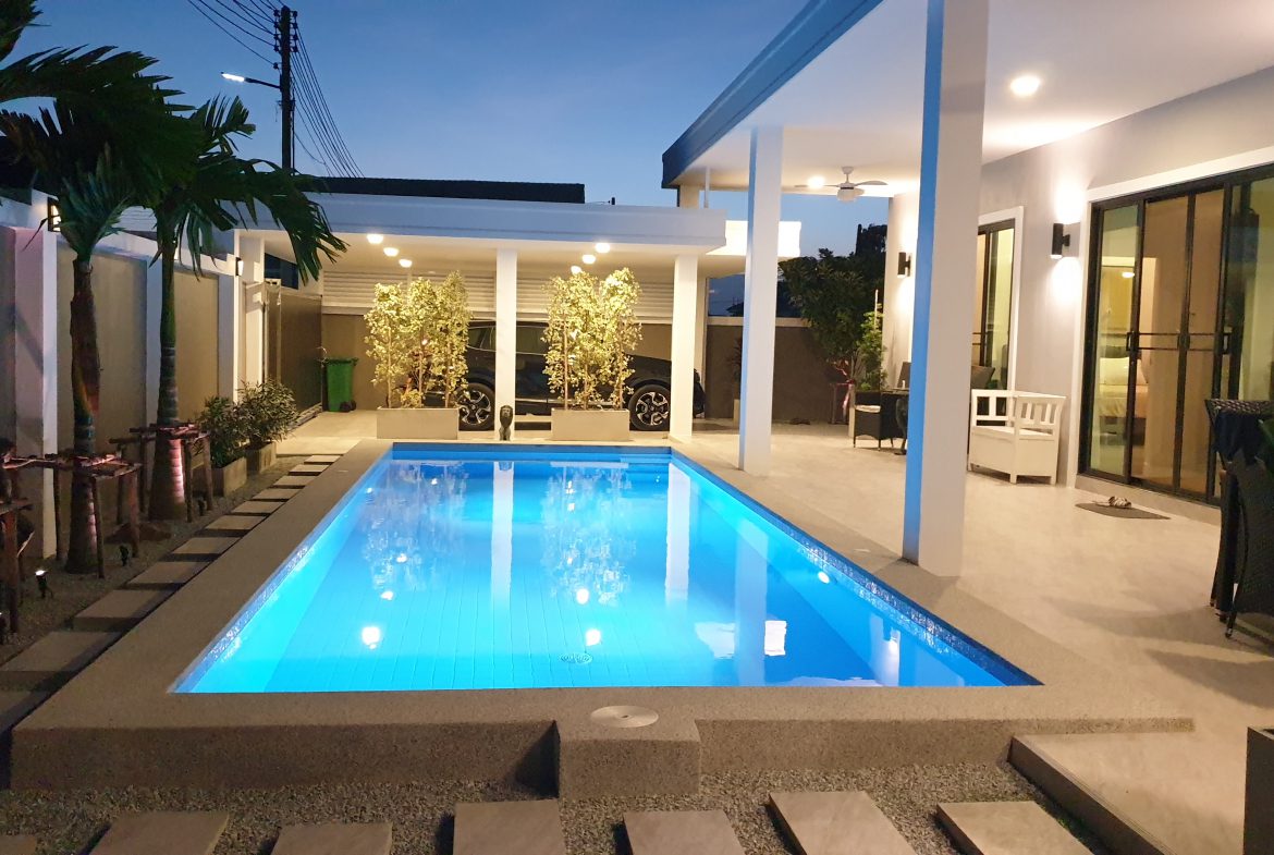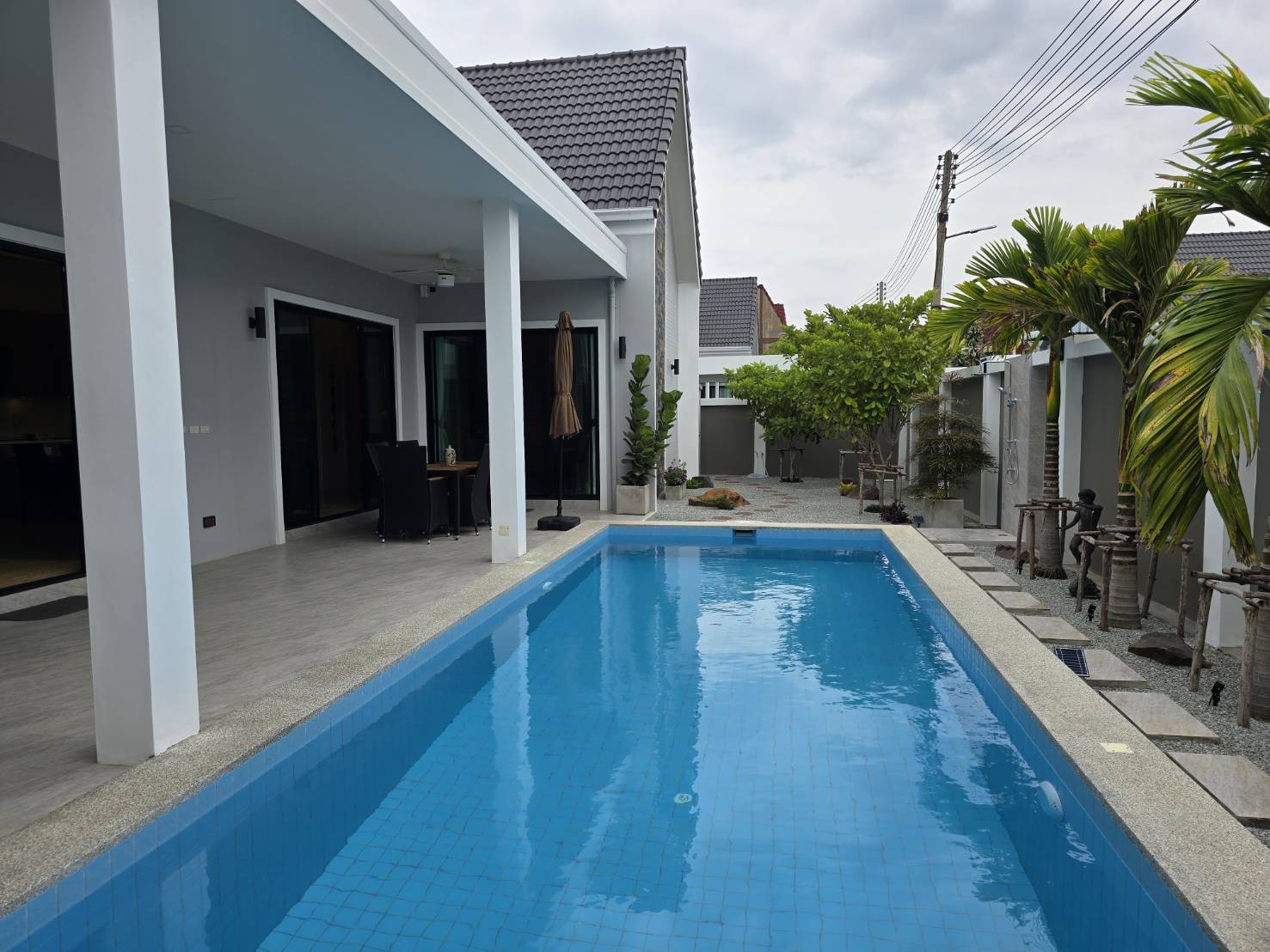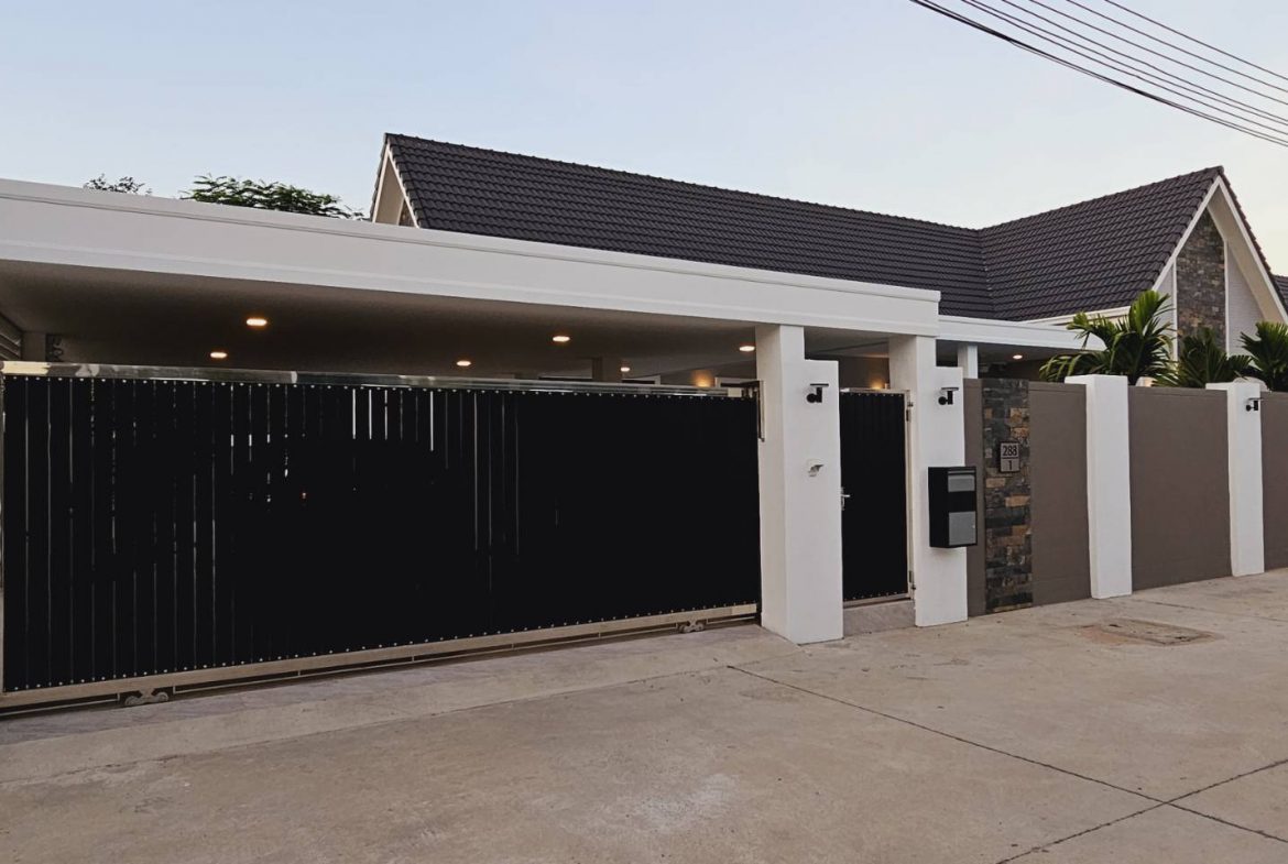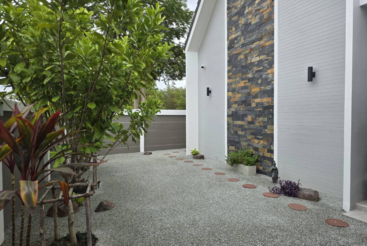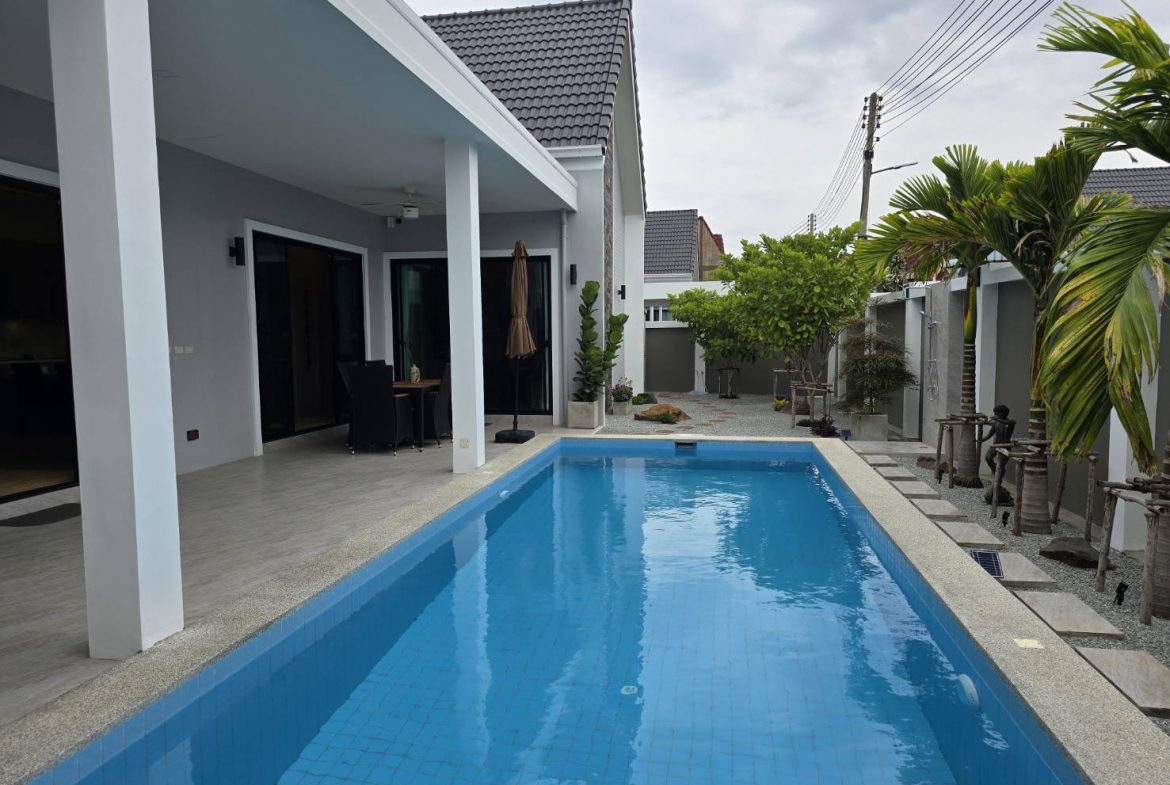 . Completed in November 2023, the villa is in a new development of a projected 25 homes called Parkside Pool Villas near Lake Mabprachan. The location is excellent, near Road 3240 and off of Pornprapanirit 17 Road, near the fresh market and the Motorway, but in a quiet setting near the park.