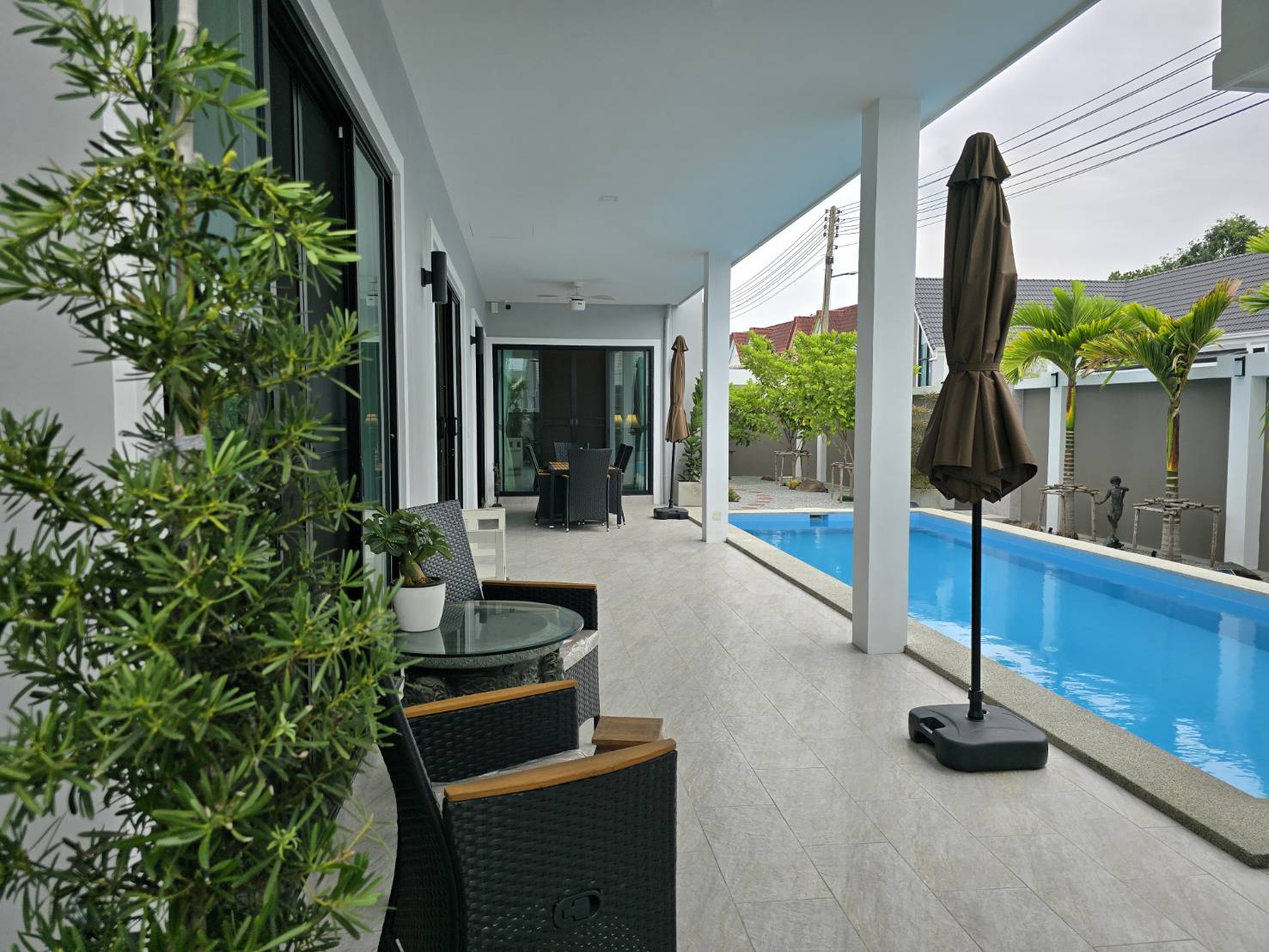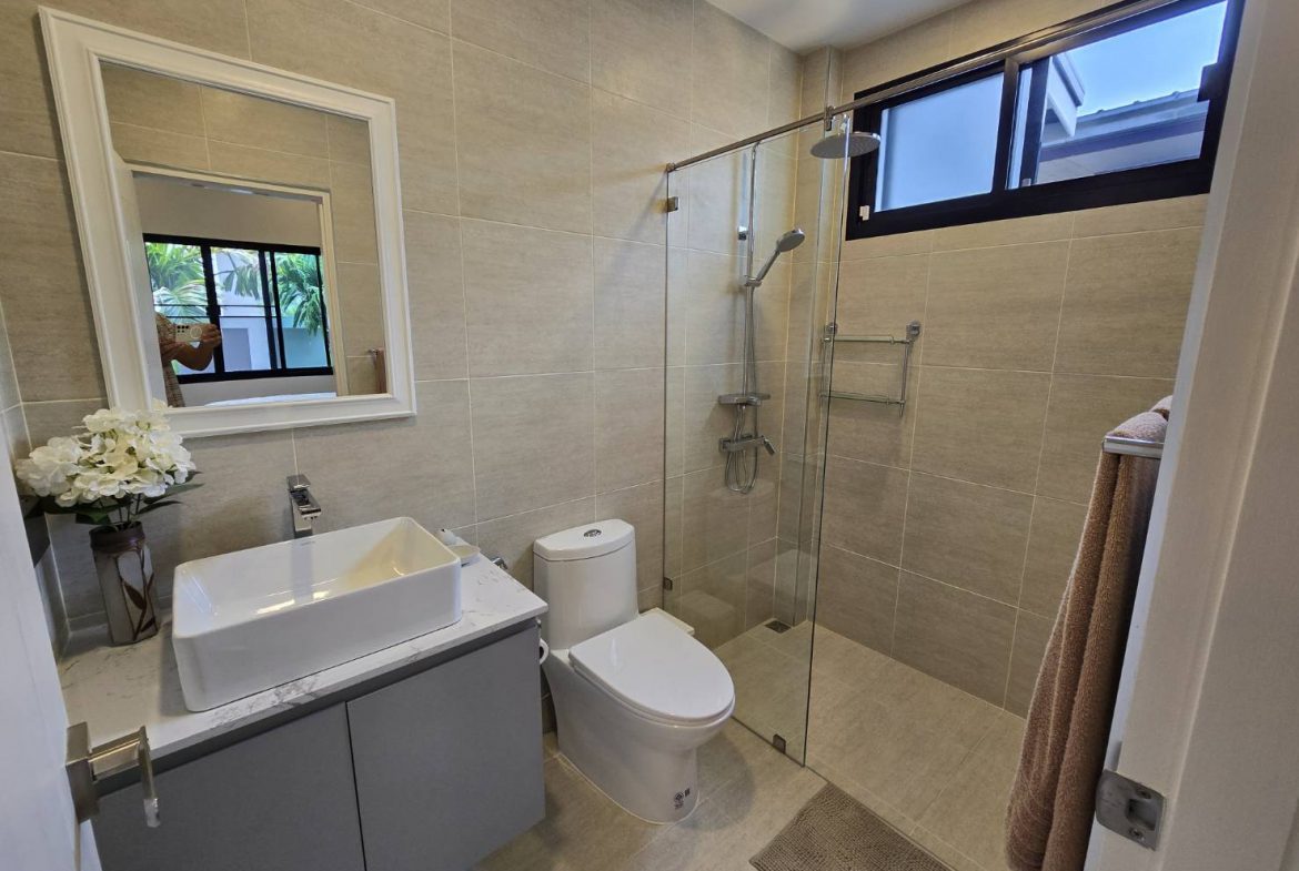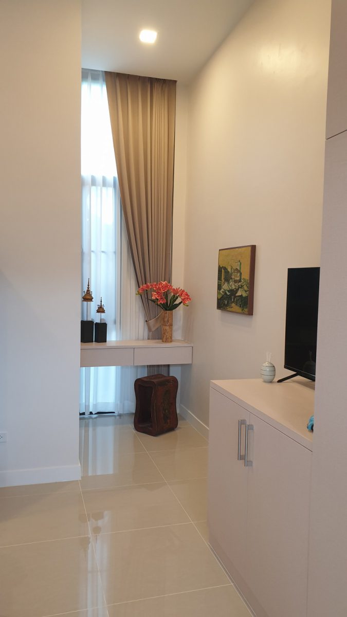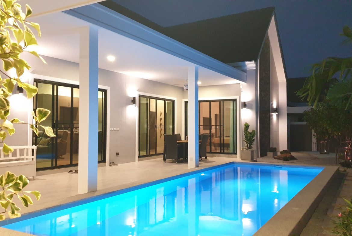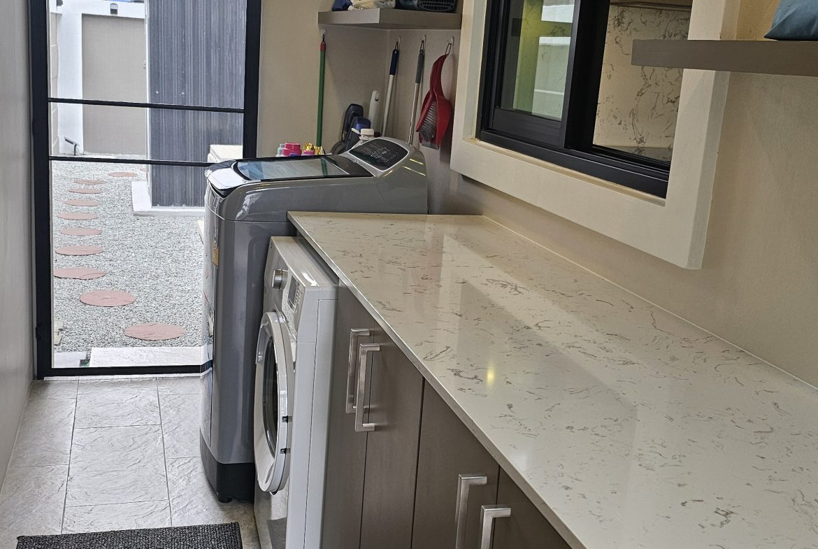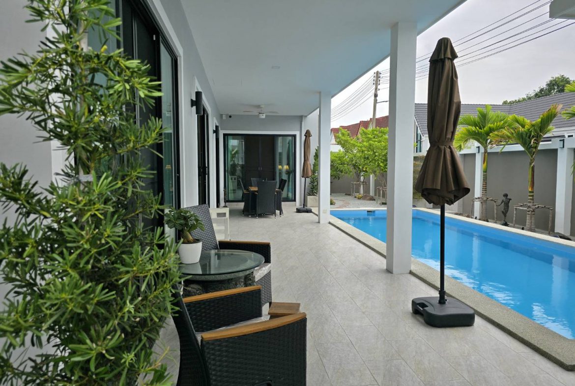 . Completed in November 2023, the villa is in a new development of a projected 25 homes called Parkside Pool Villas near Lake Mabprachan. The location is excellent, near Road 3240 and off of Pornprapanirit 17 Road, near the fresh market and the Motorway, but in a quiet setting near the park.
