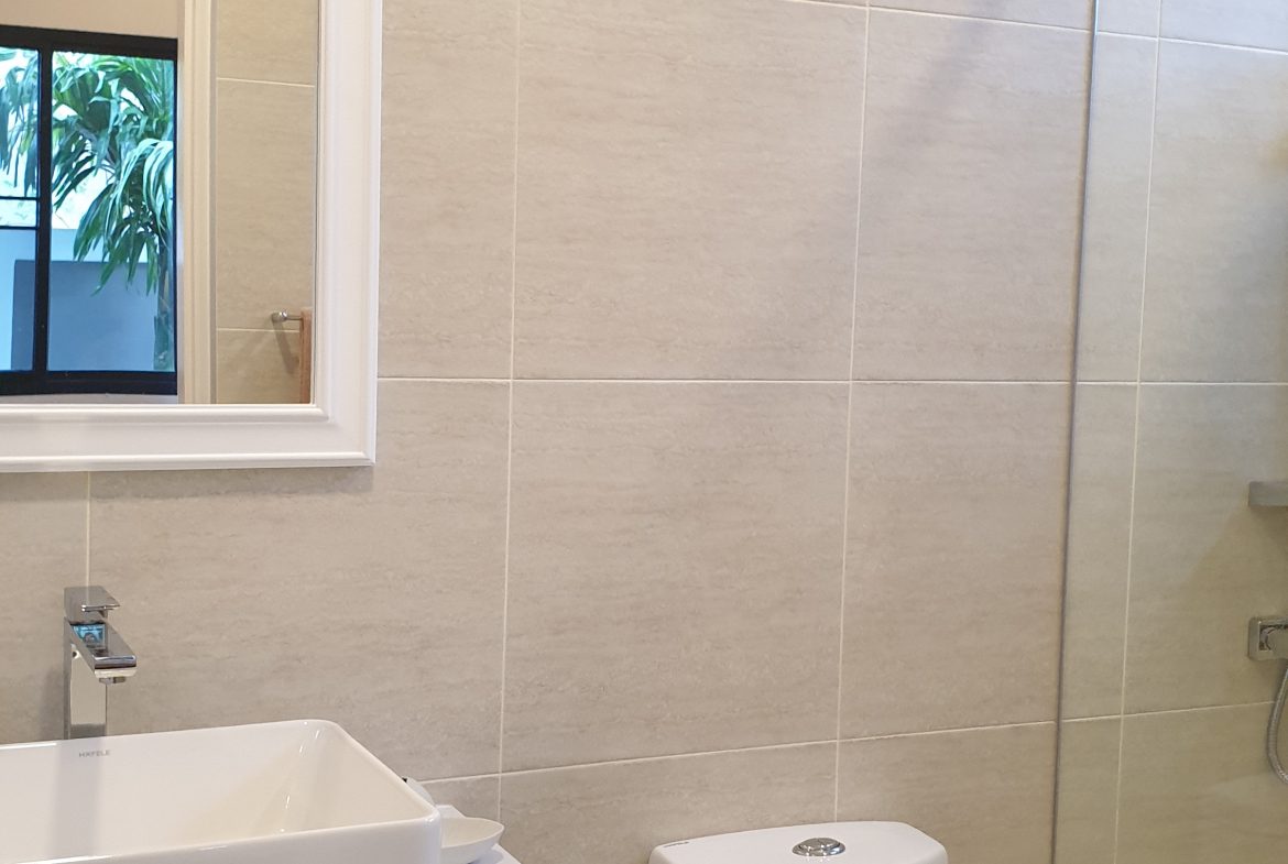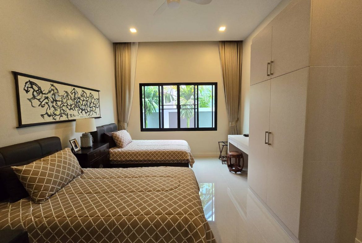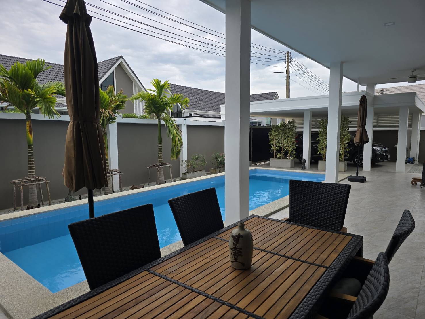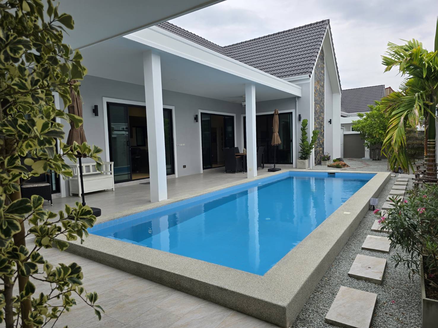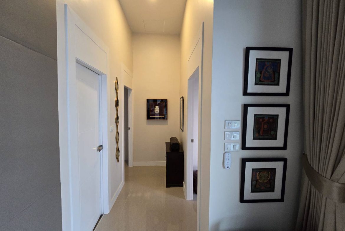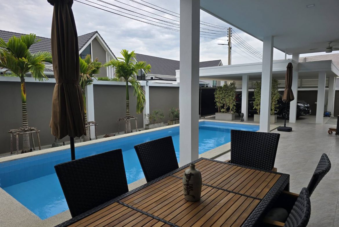 . Completed in November 2023, the villa is in a new development of a projected 25 homes called Parkside Pool Villas near Lake Mabprachan. The location is excellent, near Road 3240 and off of Pornprapanirit 17 Road, near the fresh market and the Motorway, but in a quiet setting near the park.