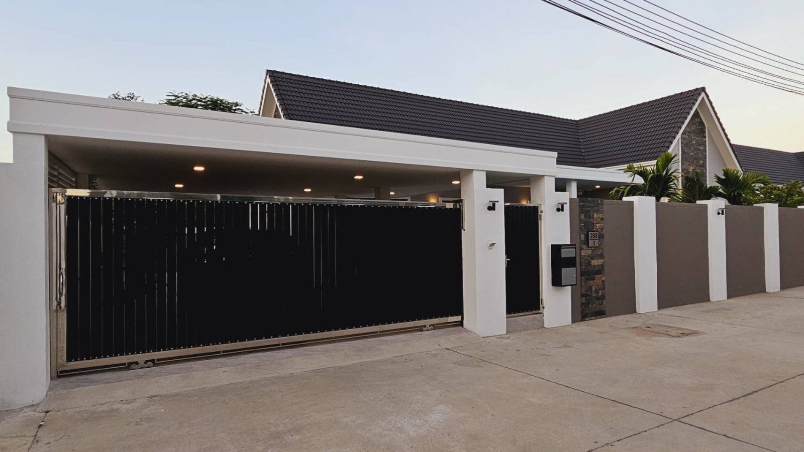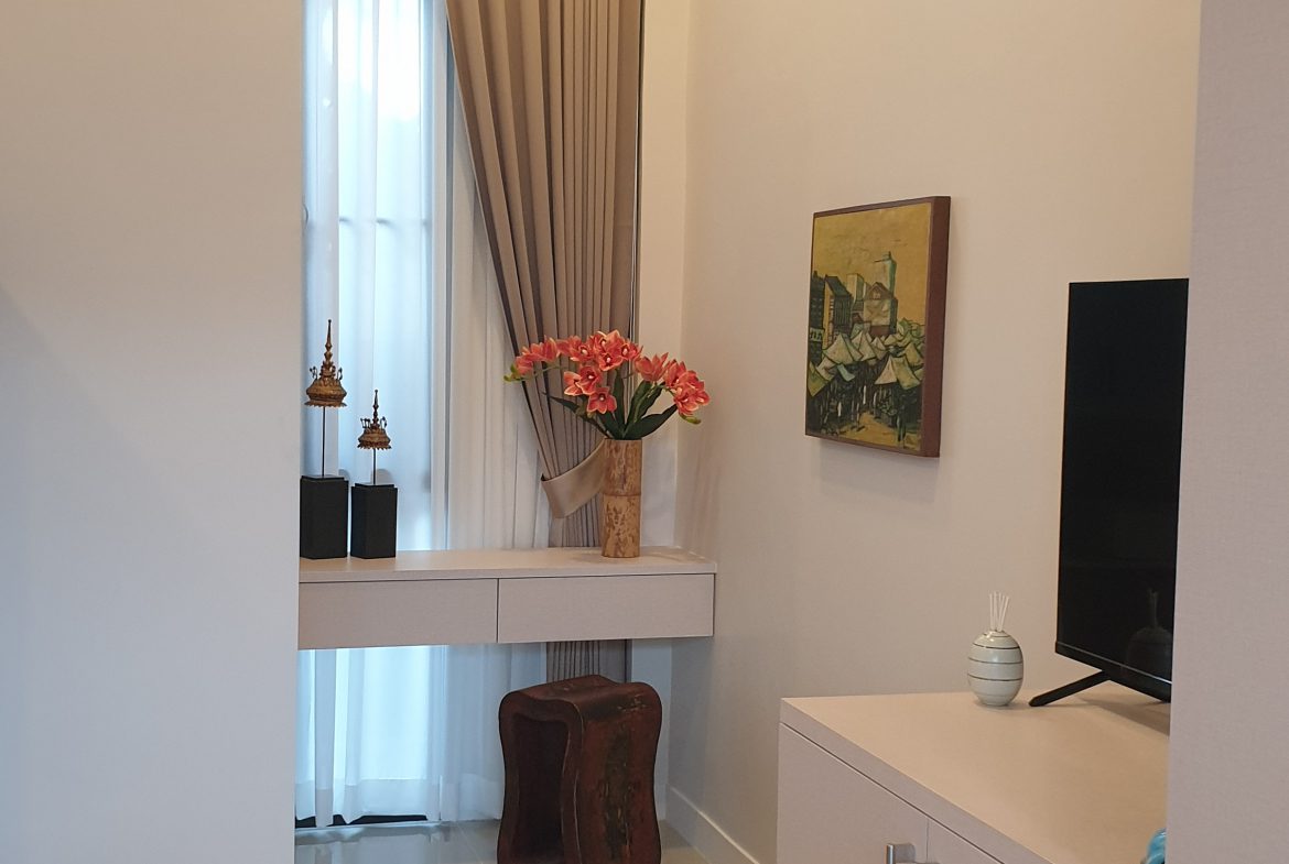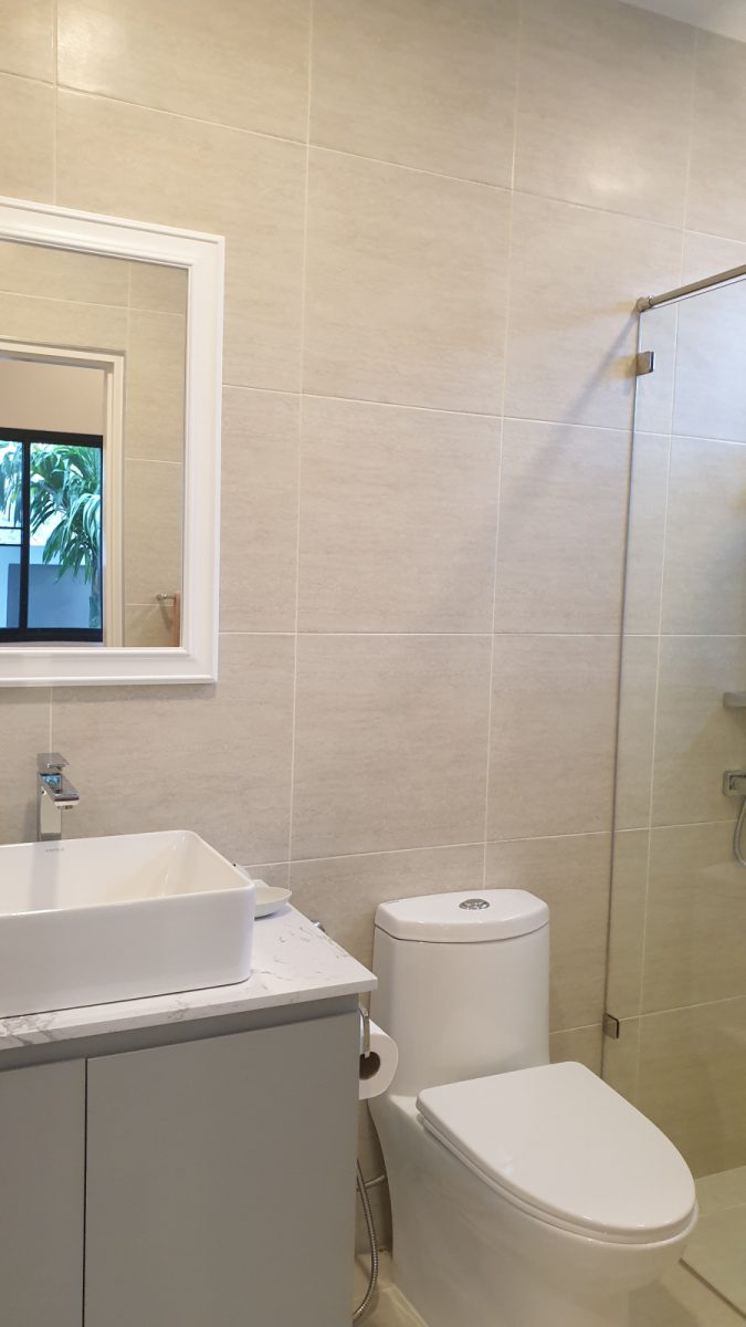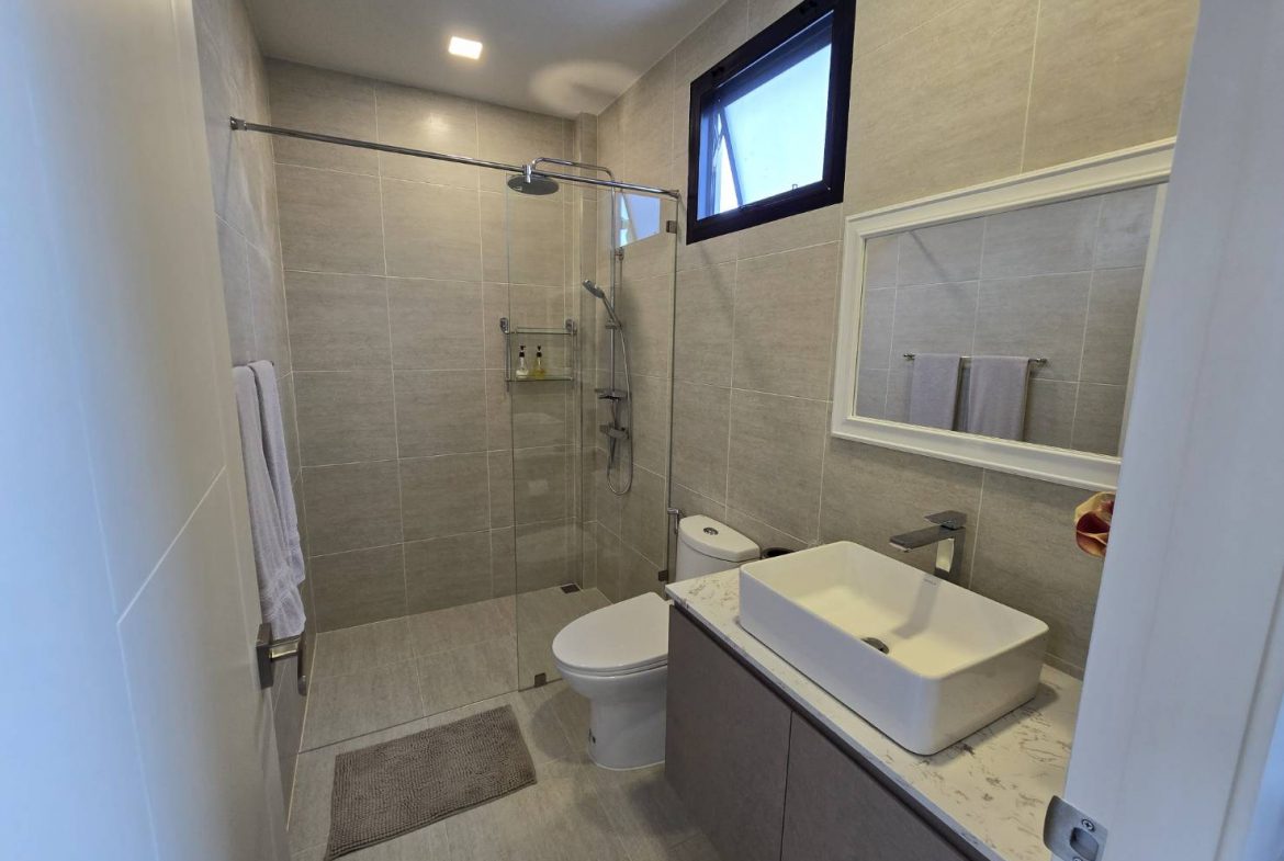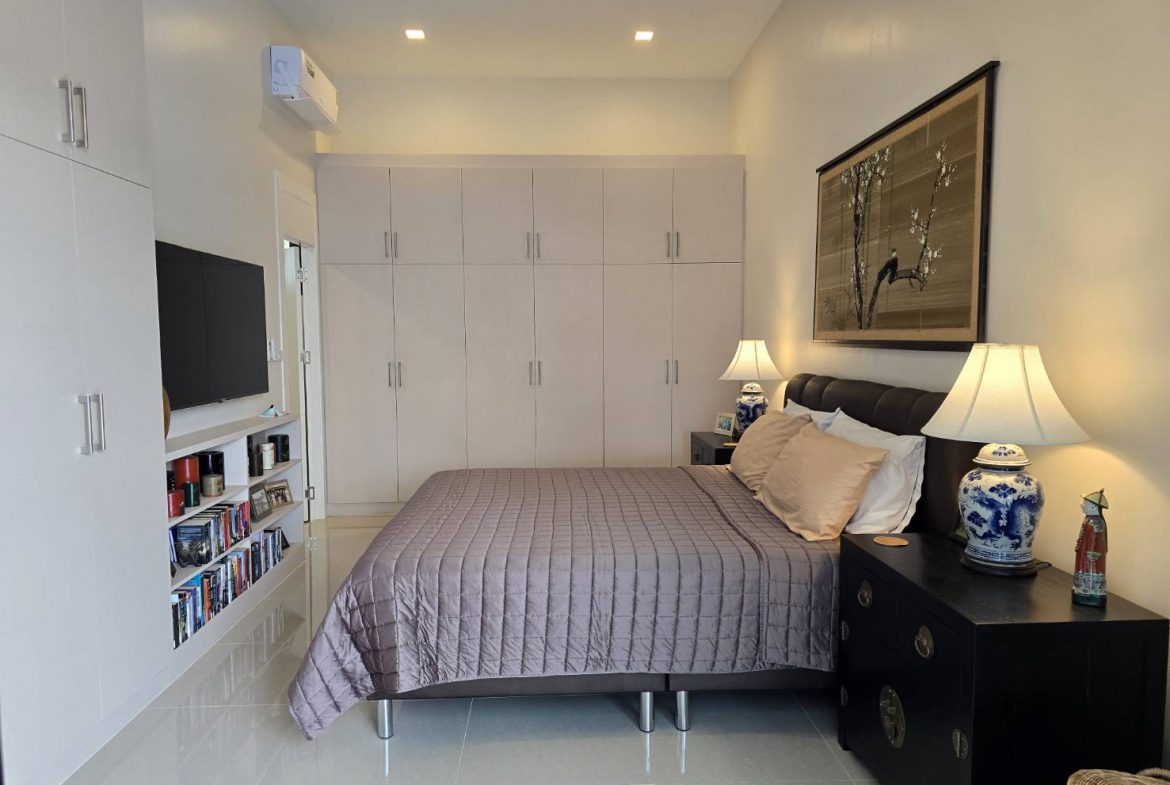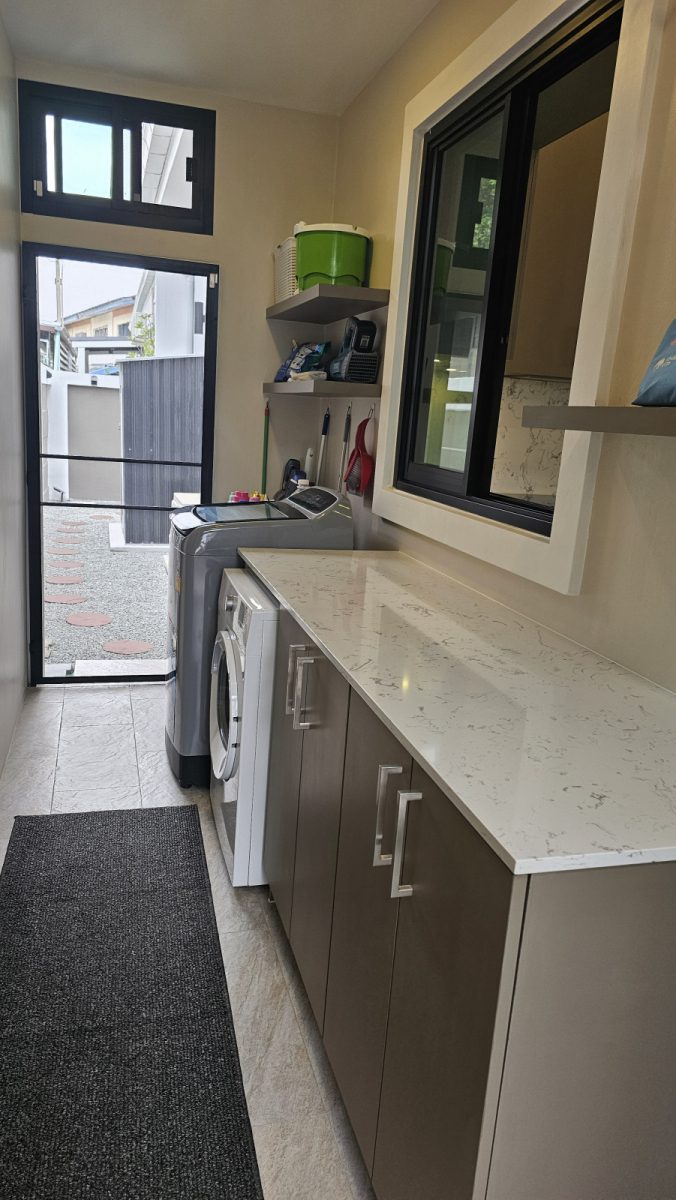 . Completed in November 2023, the villa is in a new development of a projected 25 homes called Parkside Pool Villas near Lake Mabprachan. The location is excellent, near Road 3240 and off of Pornprapanirit 17 Road, near the fresh market and the Motorway, but in a quiet setting near the park.