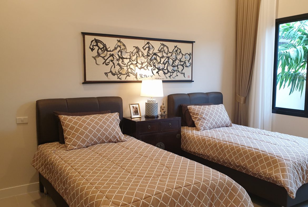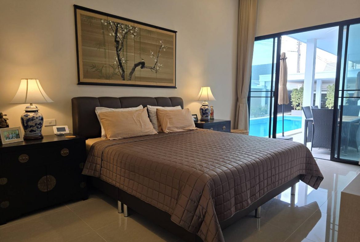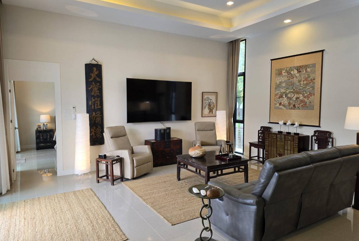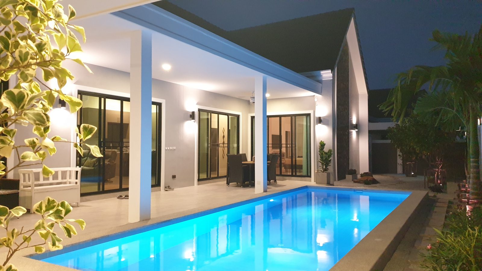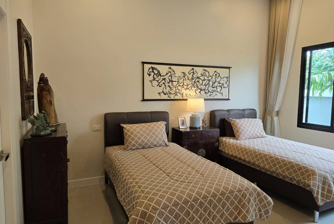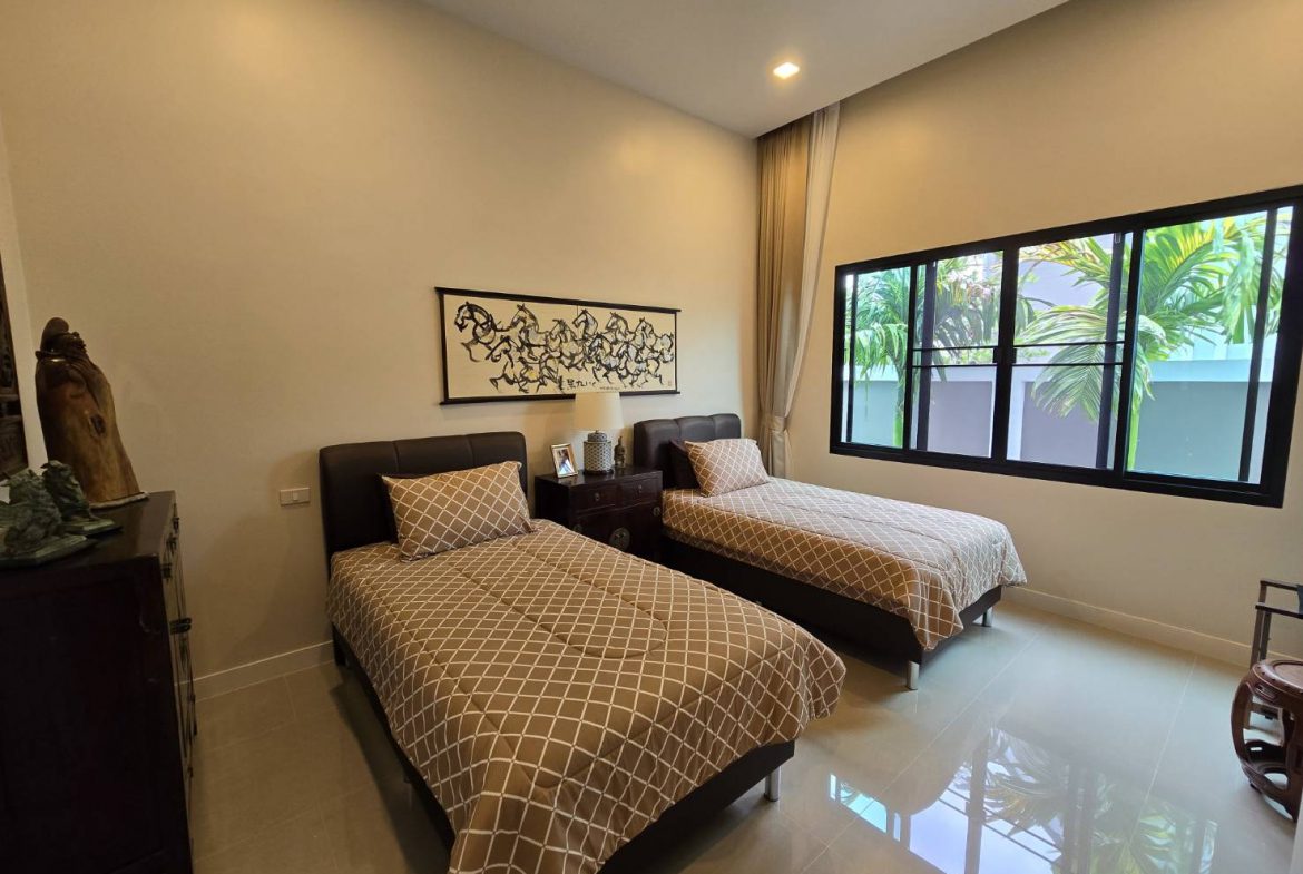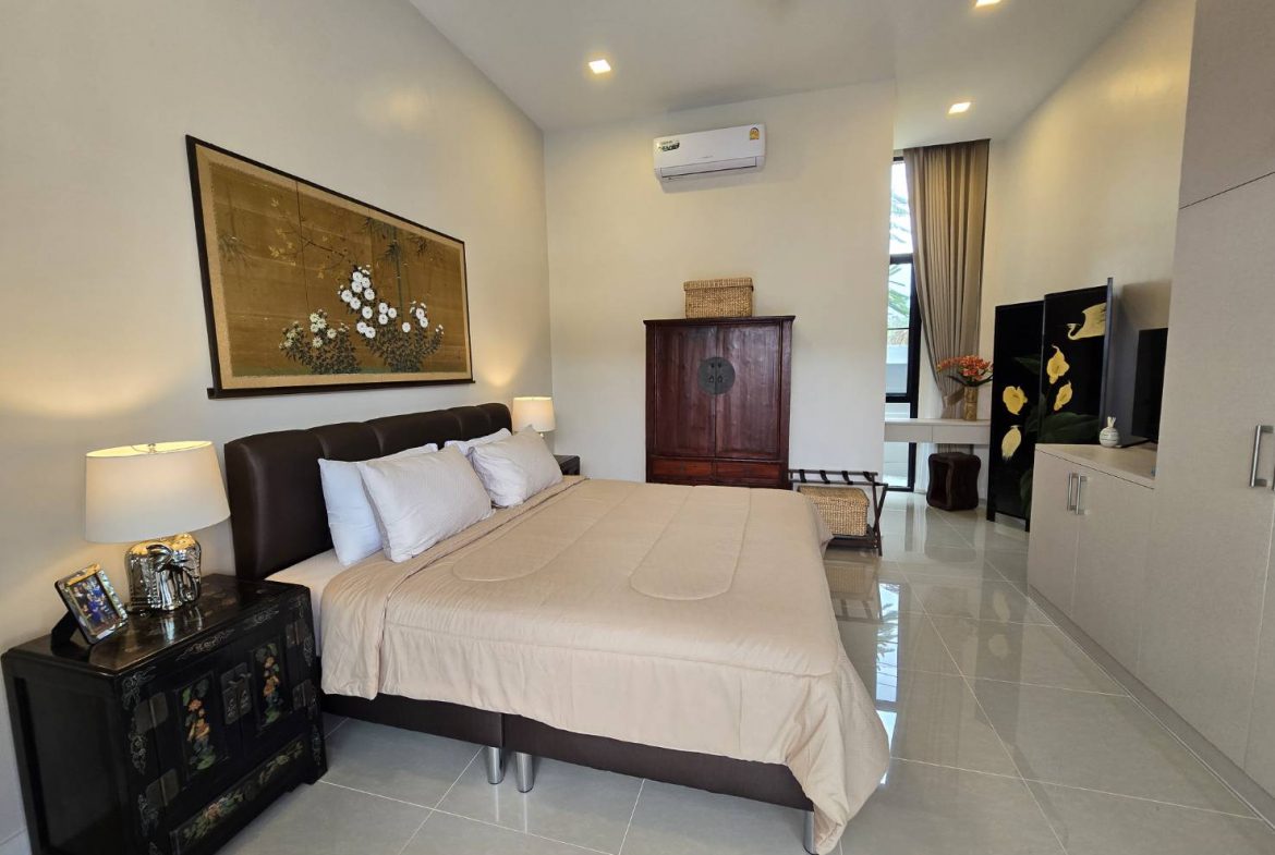 . Completed in November 2023, the villa is in a new development of a projected 25 homes called Parkside Pool Villas near Lake Mabprachan. The location is excellent, near Road 3240 and off of Pornprapanirit 17 Road, near the fresh market and the Motorway, but in a quiet setting near the park.