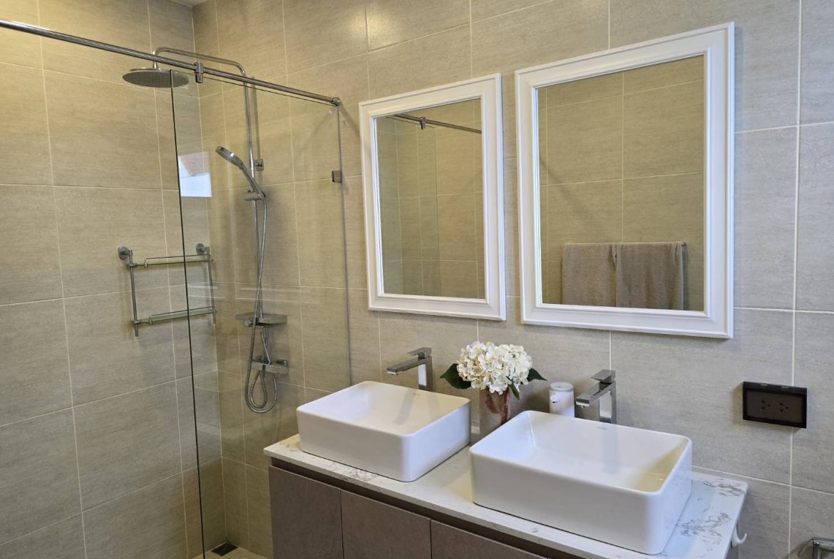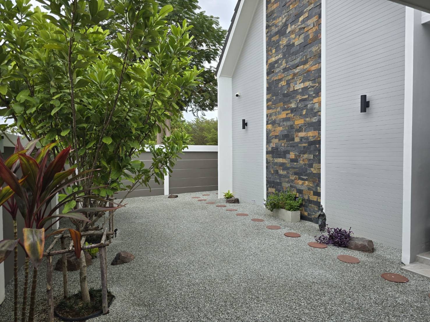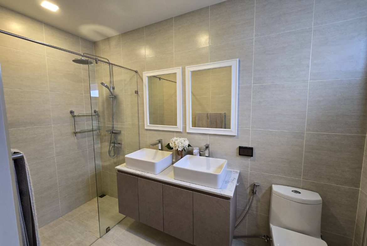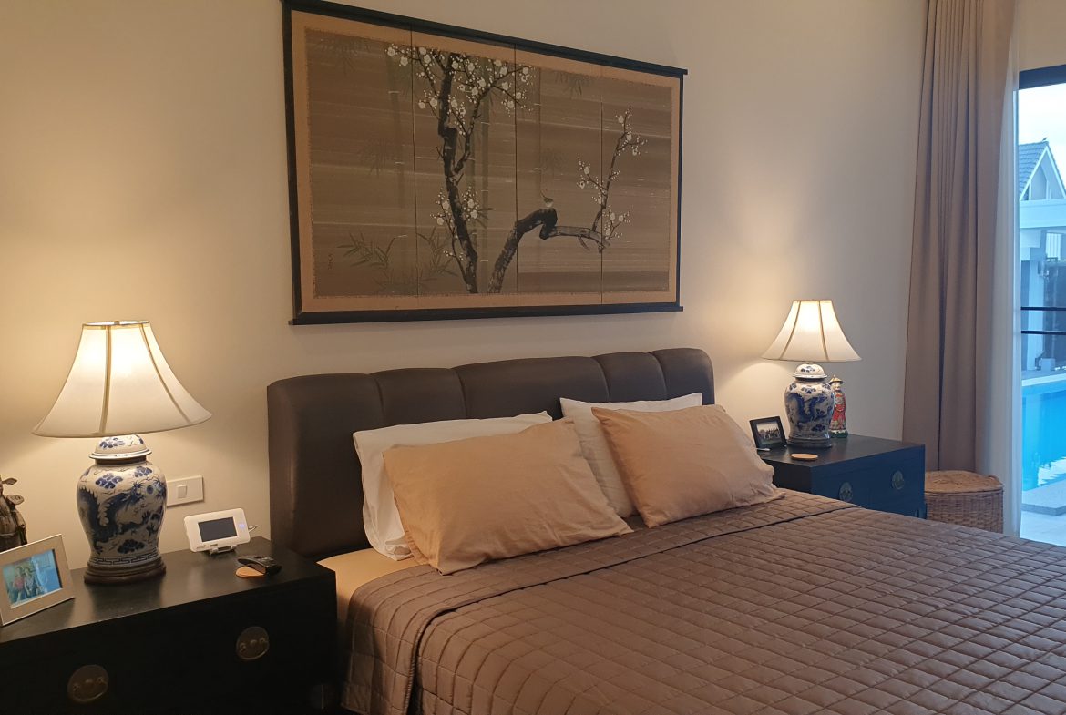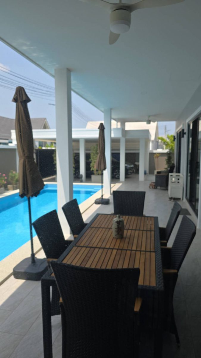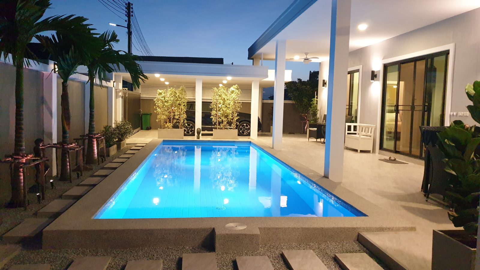 . Completed in November 2023, the villa is in a new development of a projected 25 homes called Parkside Pool Villas near Lake Mabprachan. The location is excellent, near Road 3240 and off of Pornprapanirit 17 Road, near the fresh market and the Motorway, but in a quiet setting near the park.