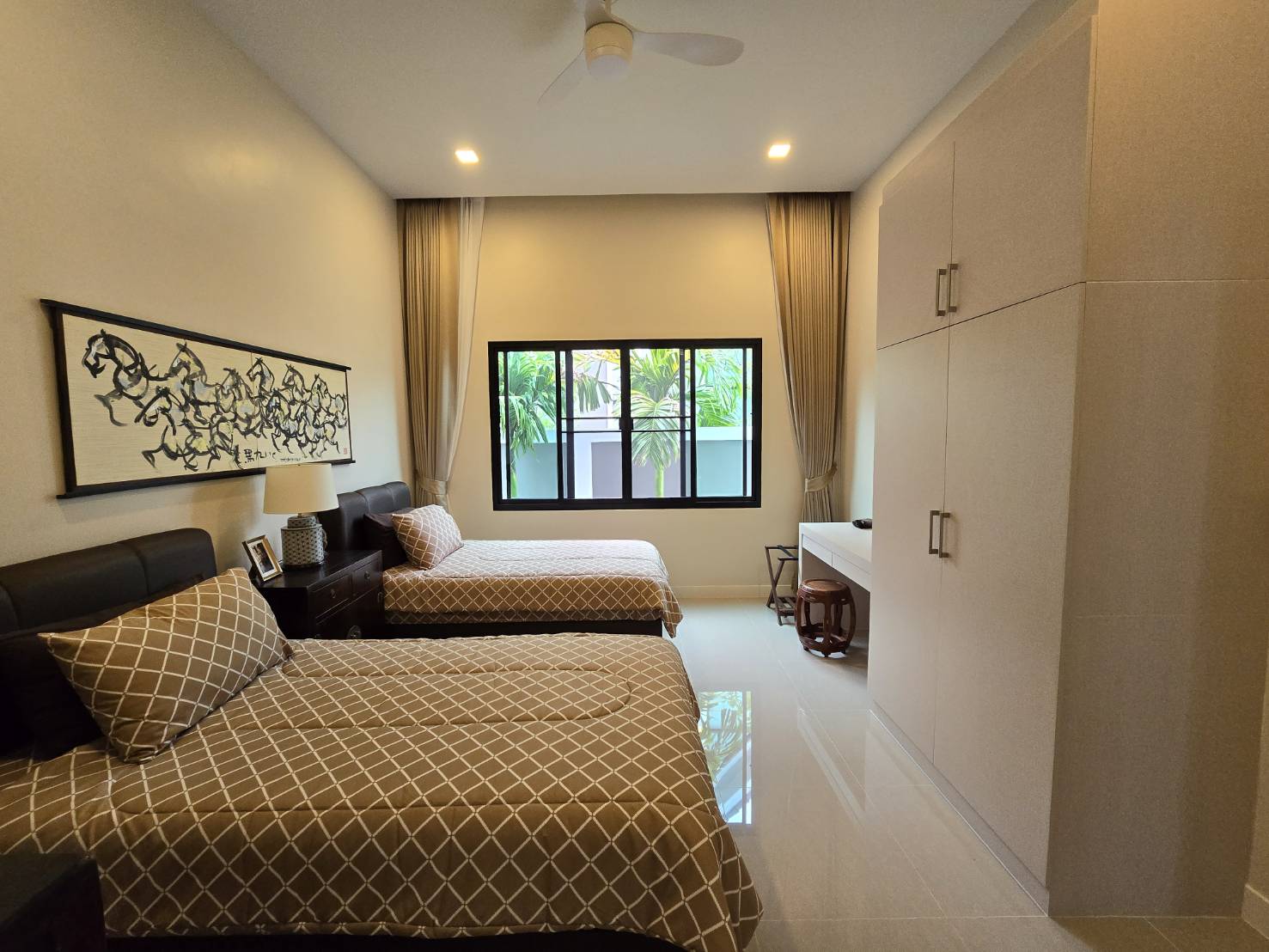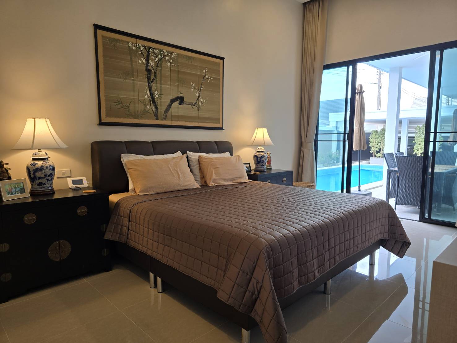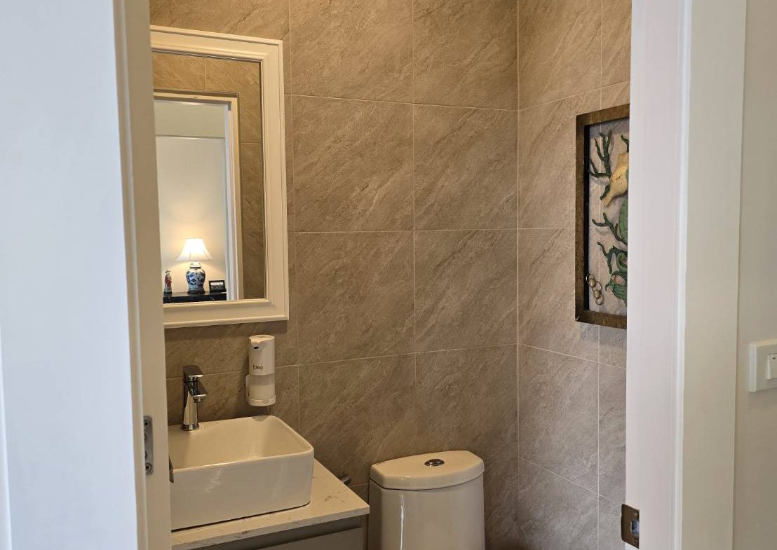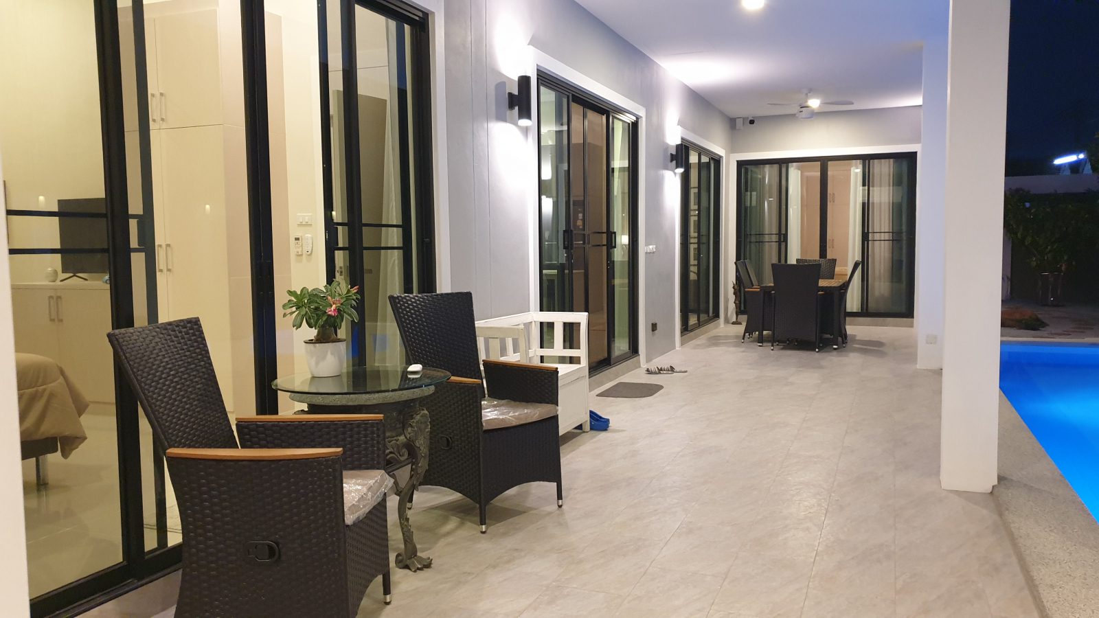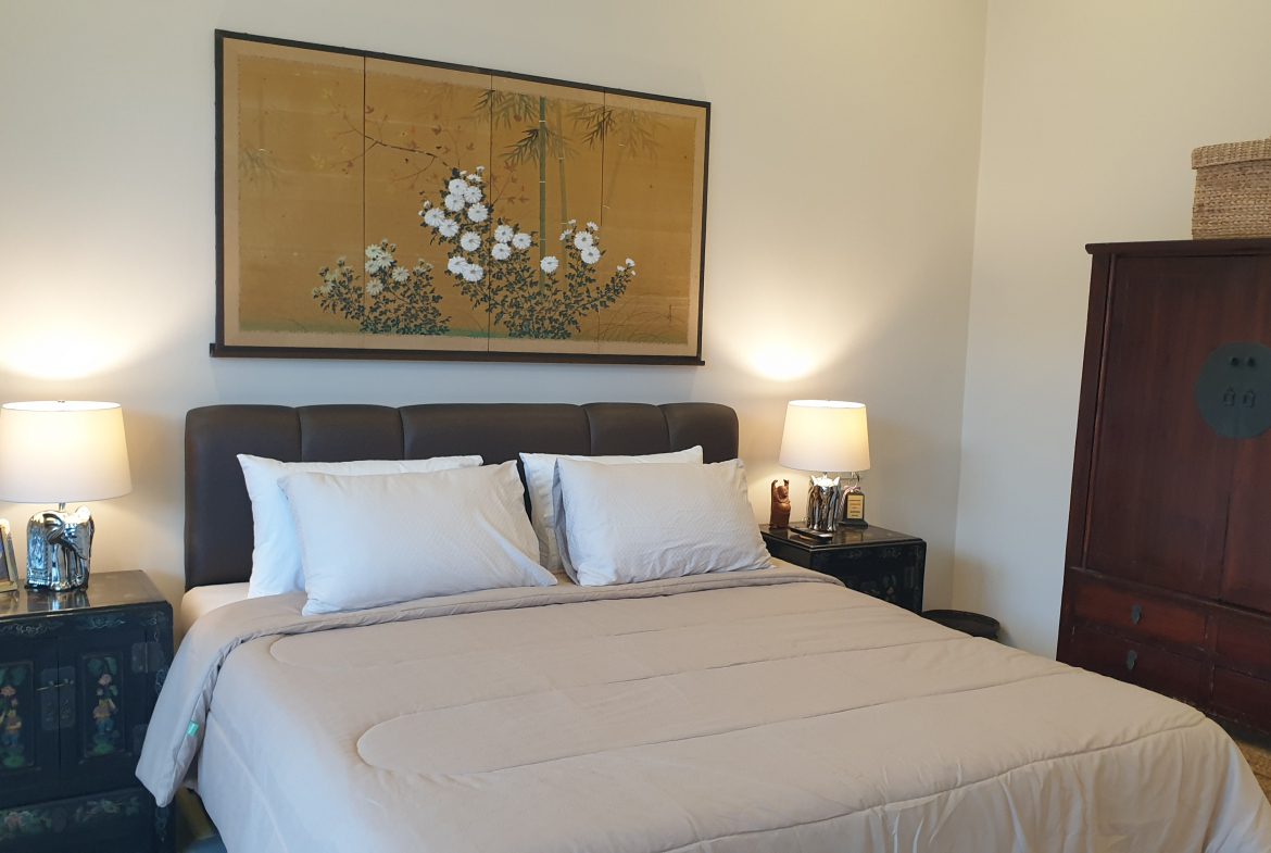 . Completed in November 2023, the villa is in a new development of a projected 25 homes called Parkside Pool Villas near Lake Mabprachan. The location is excellent, near Road 3240 and off of Pornprapanirit 17 Road, near the fresh market and the Motorway, but in a quiet setting near the park.