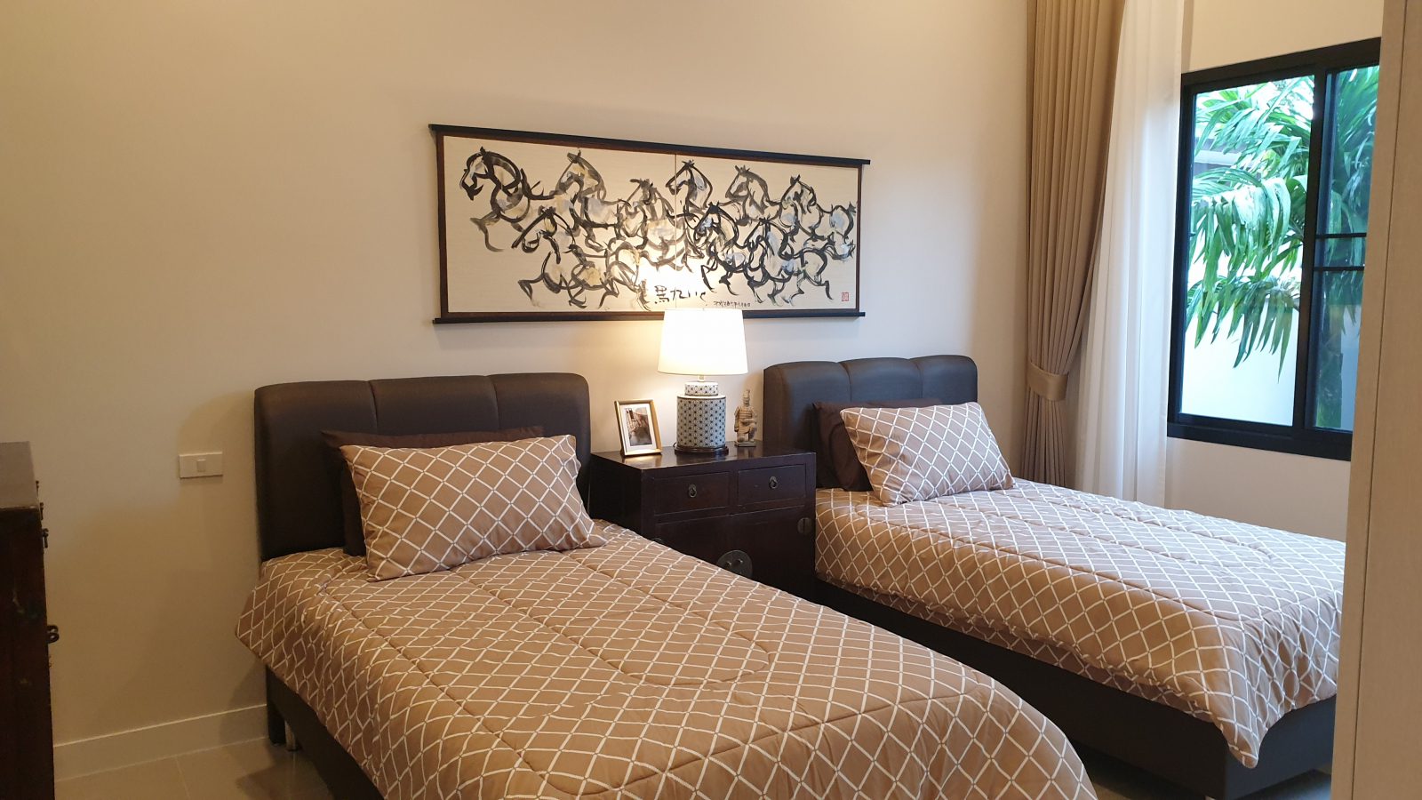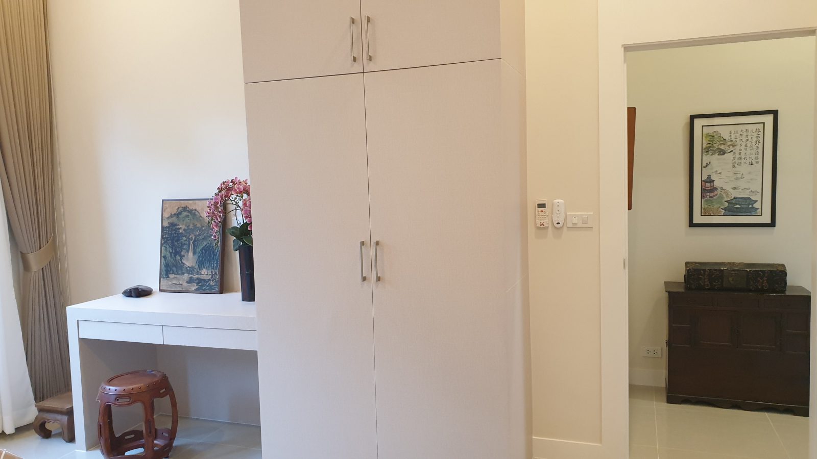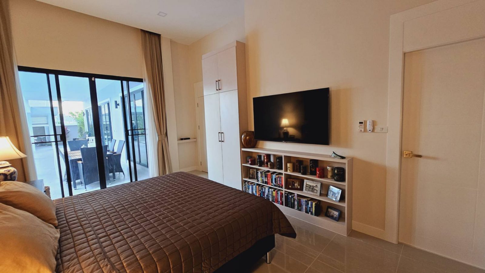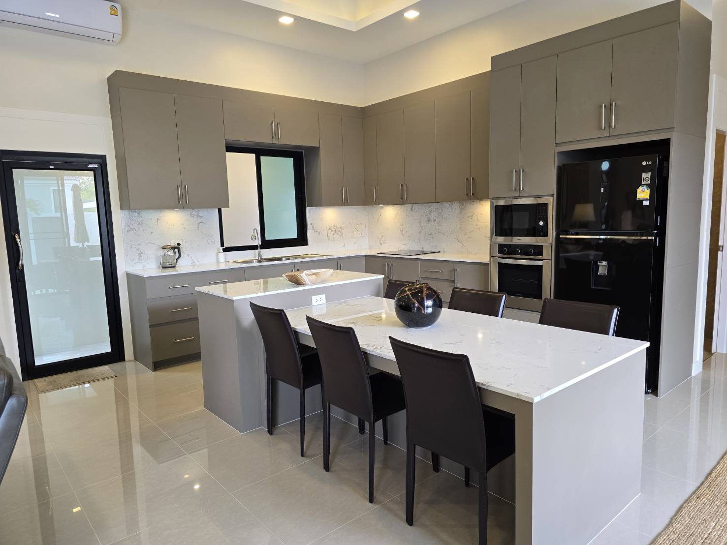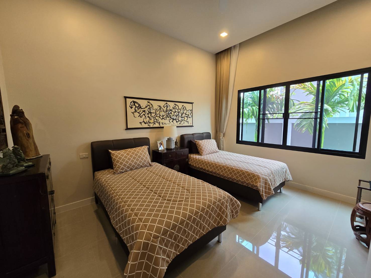 . Completed in November 2023, the villa is in a new development of a projected 25 homes called Parkside Pool Villas near Lake Mabprachan. The location is excellent, near Road 3240 and off of Pornprapanirit 17 Road, near the fresh market and the Motorway, but in a quiet setting near the park.