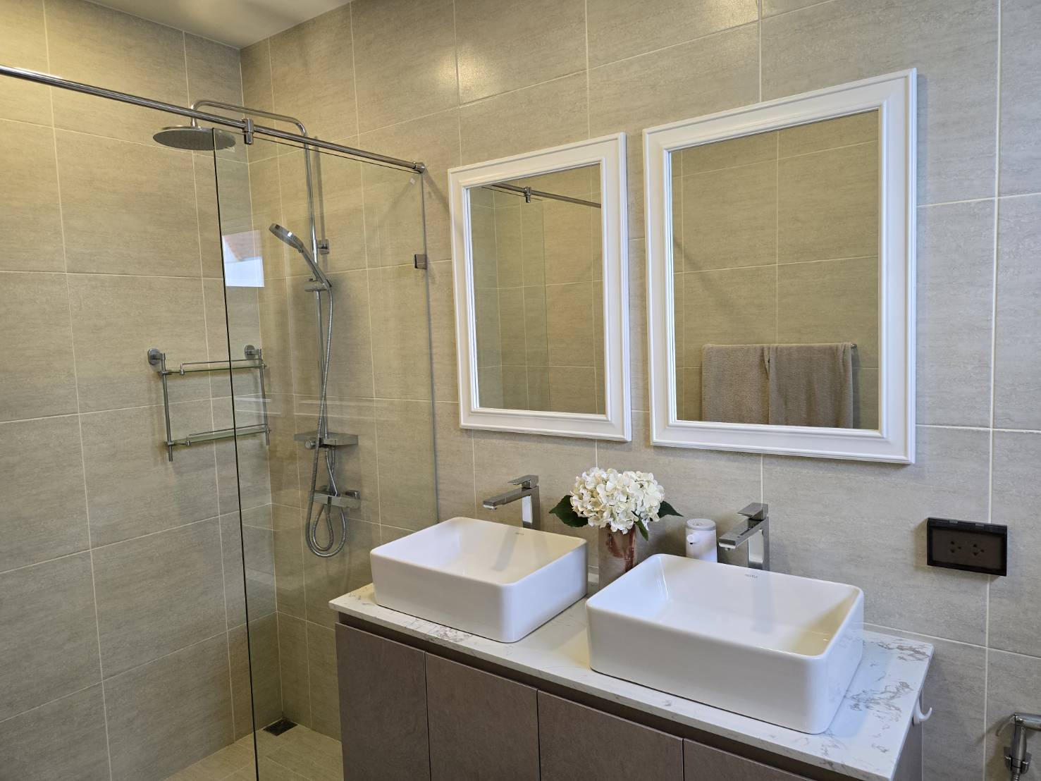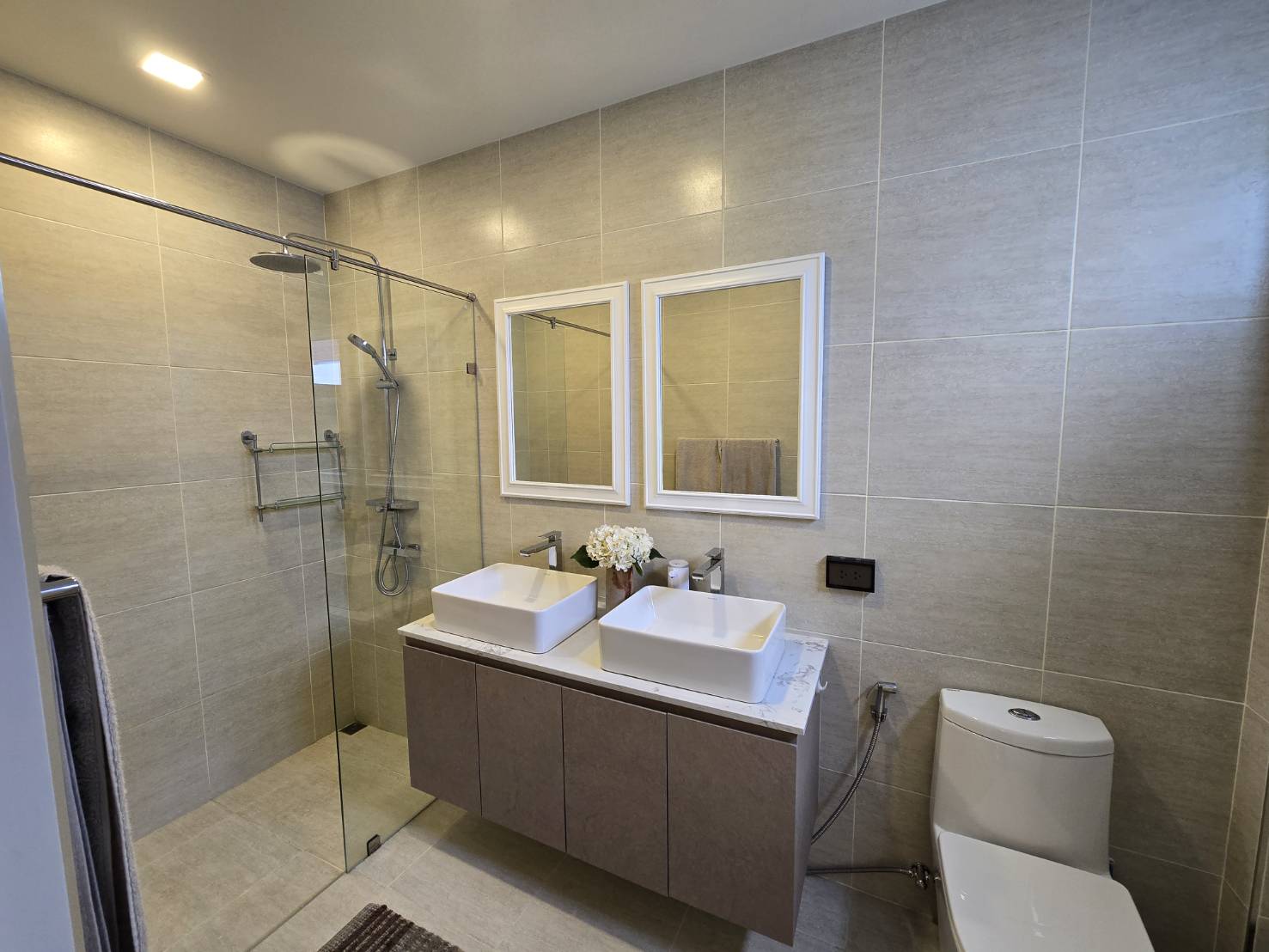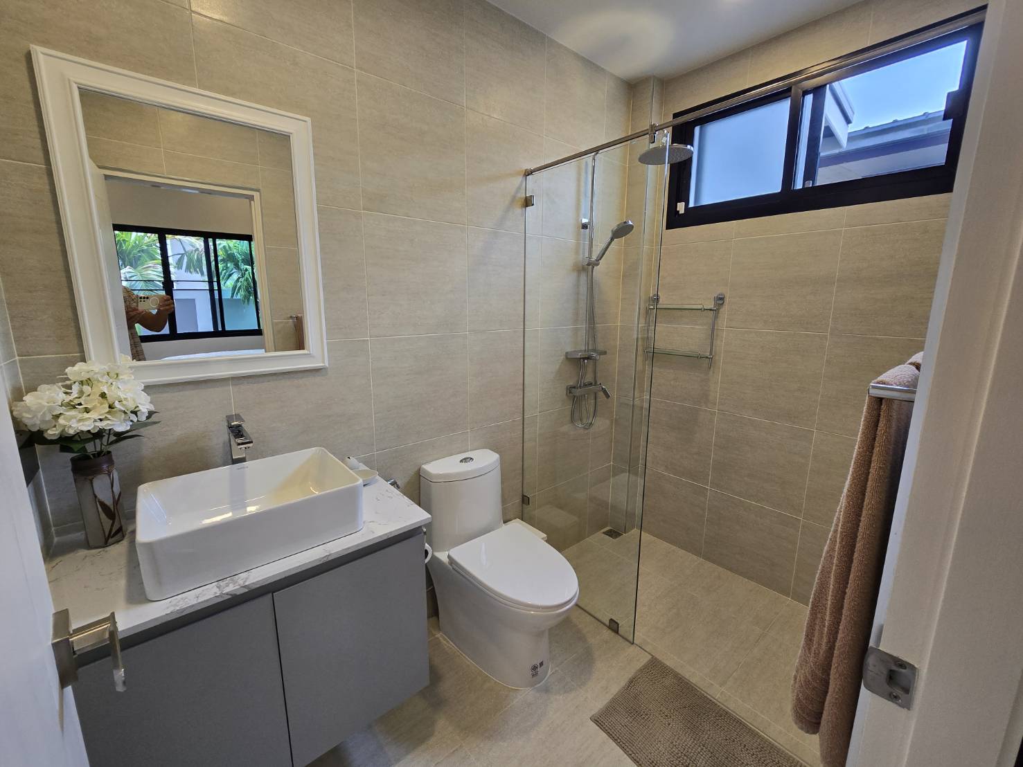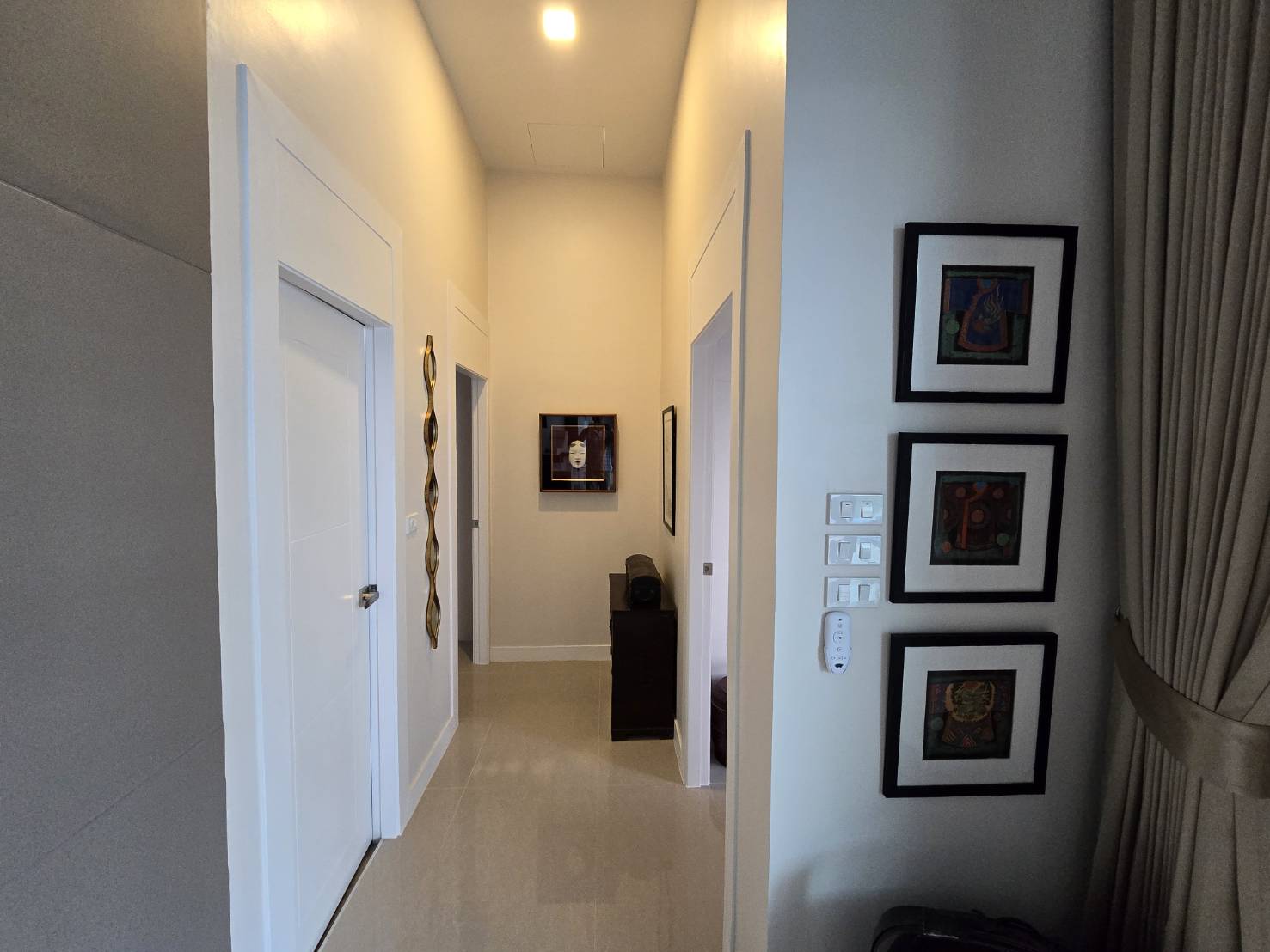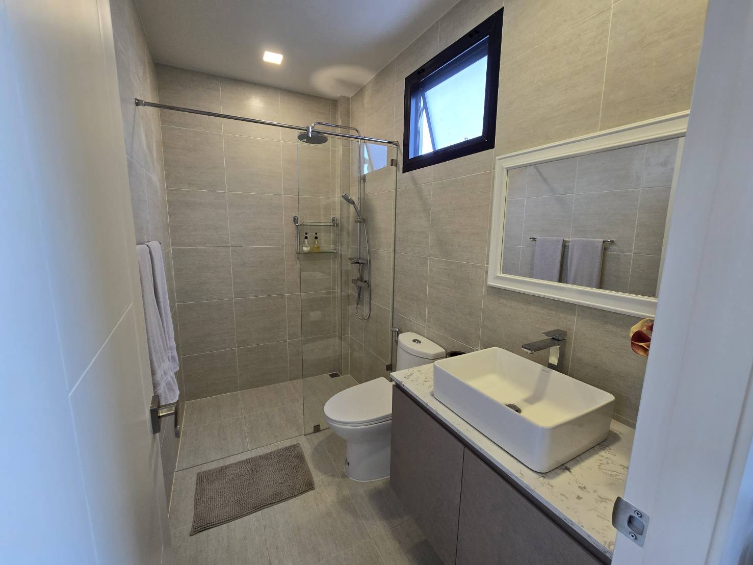 . Completed in November 2023, the villa is in a new development of a projected 25 homes called Parkside Pool Villas near Lake Mabprachan. The location is excellent, near Road 3240 and off of Pornprapanirit 17 Road, near the fresh market and the Motorway, but in a quiet setting near the park.