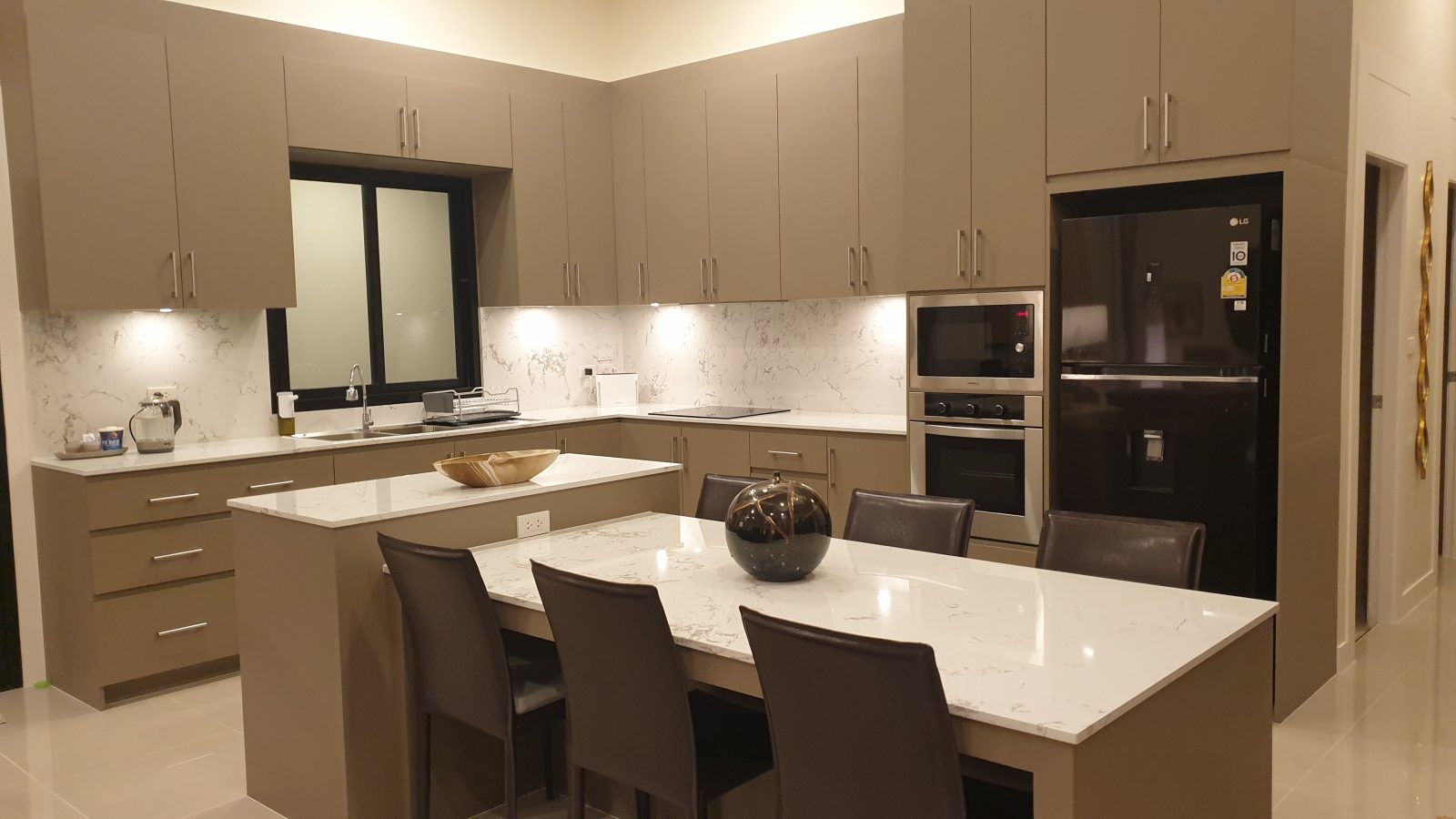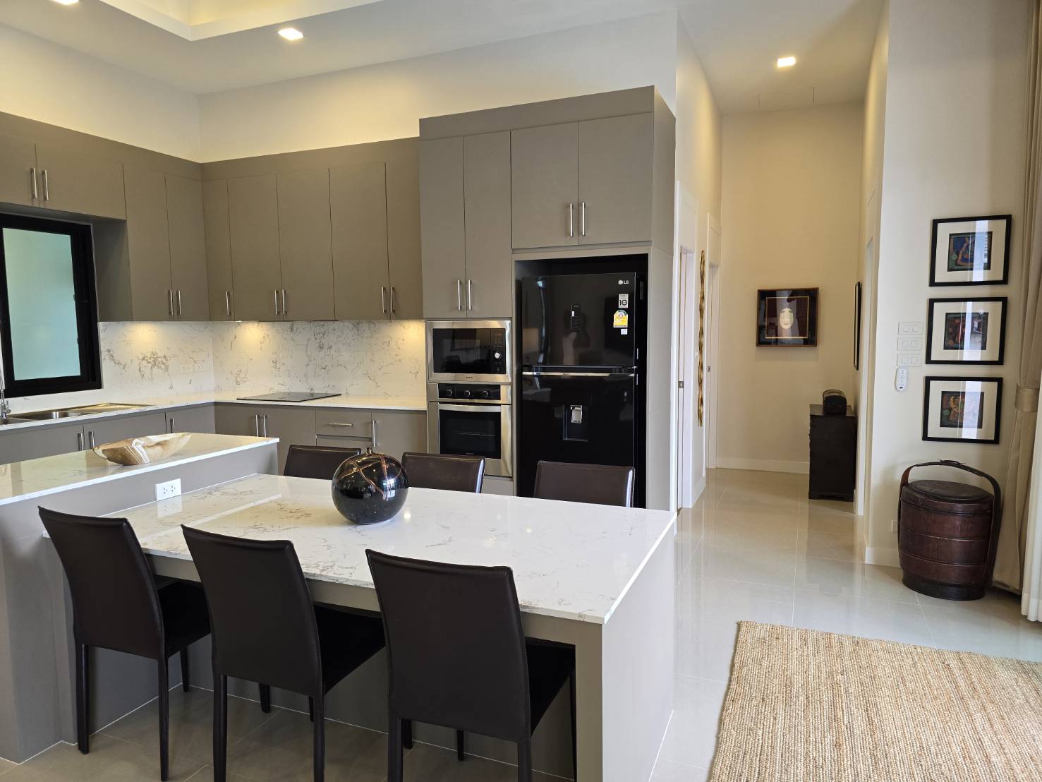The well-equipped kitchen with extensive cabinet storage has a built-in microwave and oven, double sink, hidden exhaust hood, and a large refrigerator with automatic ice maker and water dispenser.