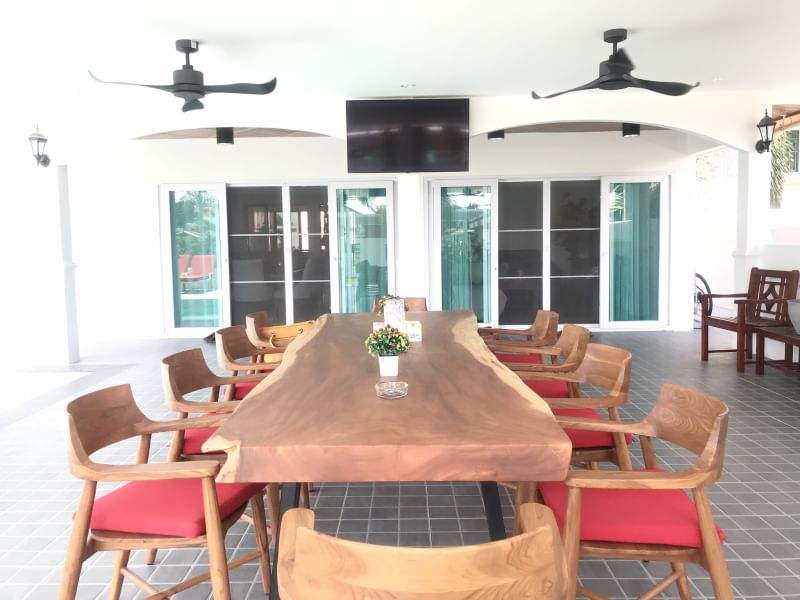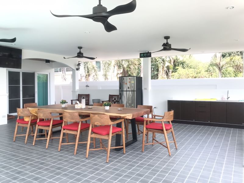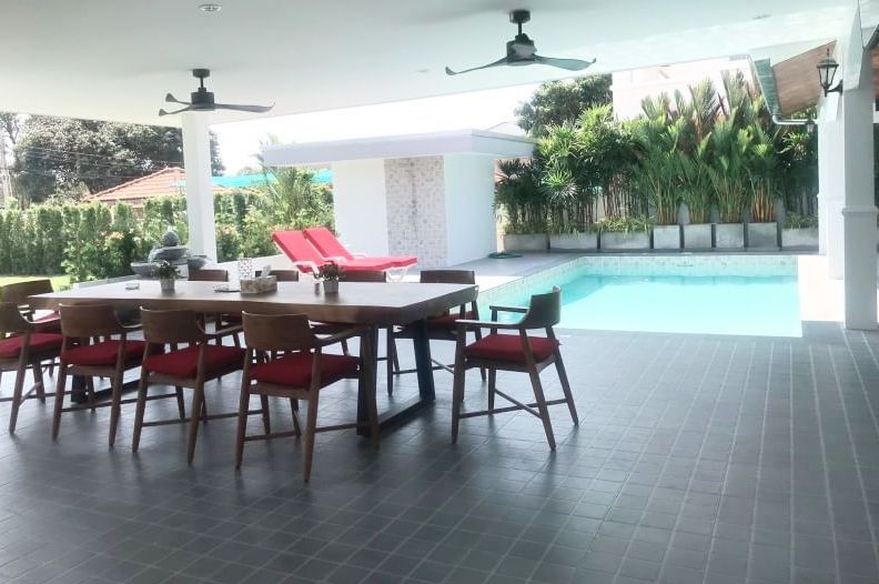 Pool villa modern style with large garden. Land size 800 Sq.m. 3 bedrooms 3 bathrooms with outdoor dining. European kitchen, fully furnished, automatic gate, 2 cars parking. Ready to move in.