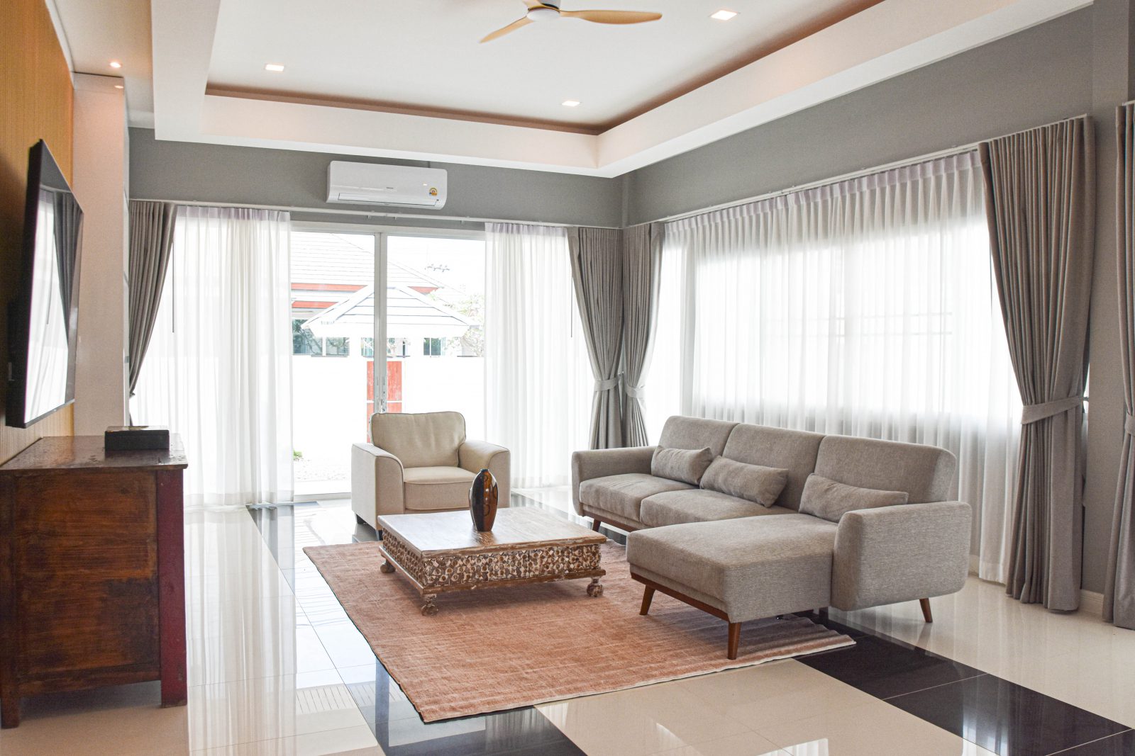 The home’s centerpiece is a brand-new European kitchen with appliances, complemented by a fully equipped outdoor kitchen — complete with gas stove, fryer, fridge, and washer — perfect for entertaining or family gatherings. The living room offers a true cinematic experience with its oversized 65″ smart TV and stylish ceiling fans throughout.