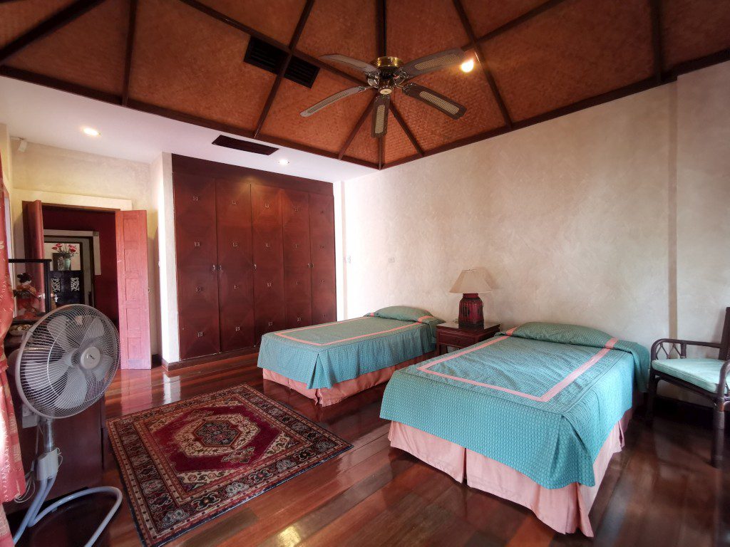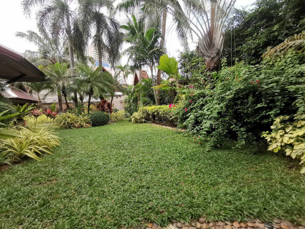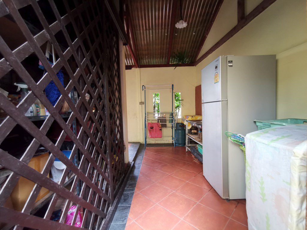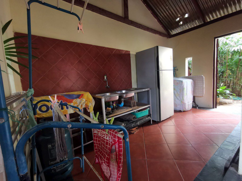 There is a security guard 24 hours in the village. Car park, maid room with bathroom, storage room, outside Thai kitchen, mid-size a garden, a small pool and there is space to build a swimming pool.
